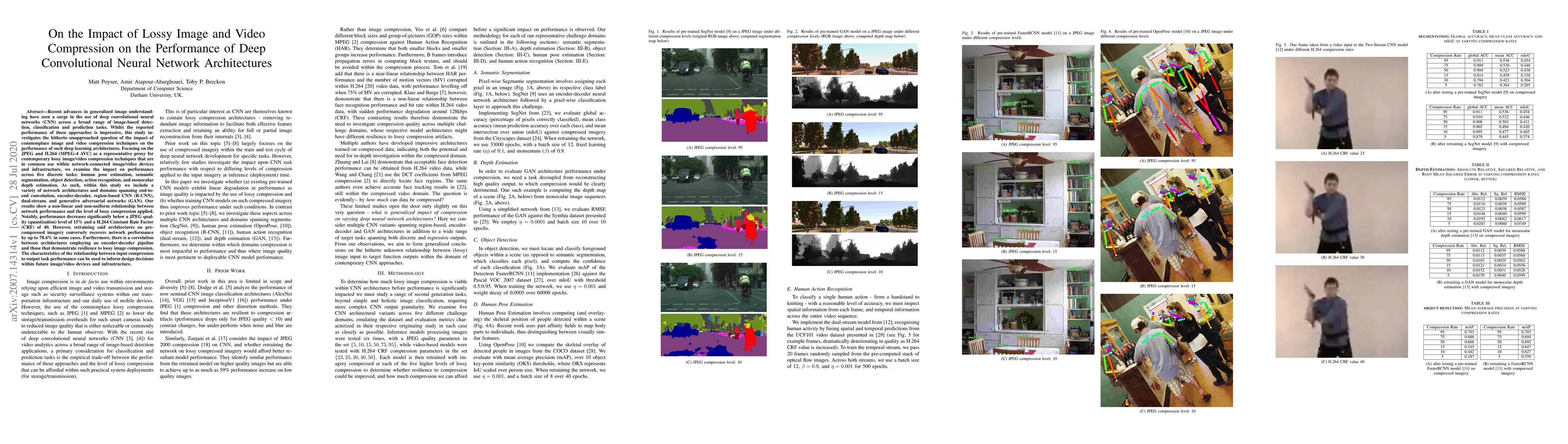 This research explores how lossy image and video compression techniques, such as JPEG and H.264, affect the performance of deep convolutional neural networks (CNNs) in various tasks. The study finds that performance drops significantly below certain compression thresholds, but retraining networks on pre-compressed data can recover much of the lost performance. The findings suggest that certain network architectures are more resilient to compression, which can guide future design decisions in image and video technologies.