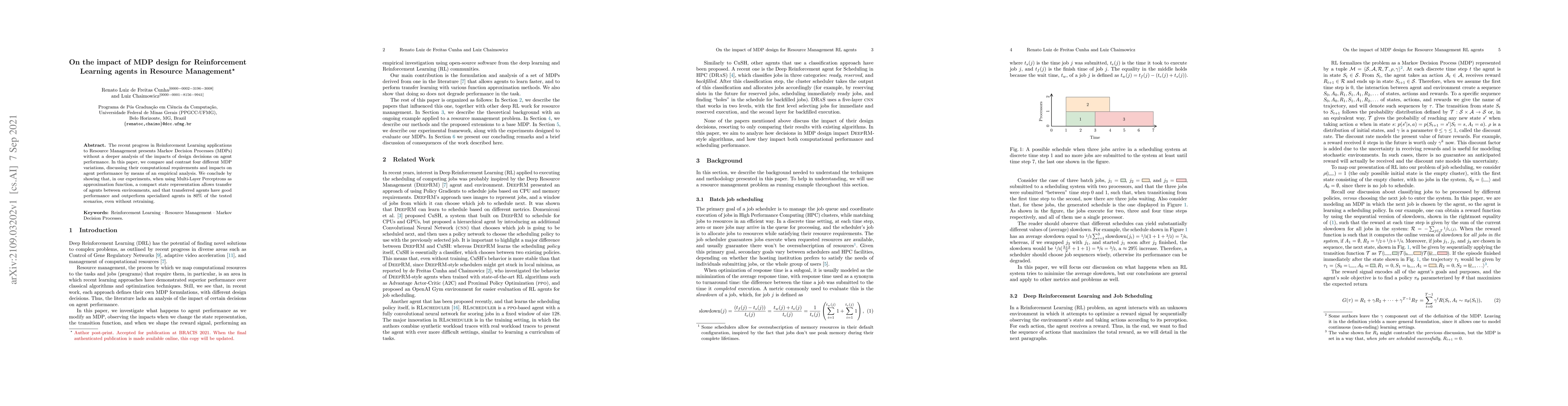 The recent progress in Reinforcement Learning applications to Resource Management presents MDPs without a deeper analysis of the impacts of design decisions on agent performance. In this paper, we compare and contrast four different MDP variations, discussing their computational requirements and impacts on agent performance by means of an empirical analysis. We conclude by showing that, in our experiments, when using Multi-Layer Perceptrons as approximation function, a compact state representation allows transfer of agents between environments, and that transferred agents have good performance and outperform specialized agents in 80\% of the tested scenarios, even without retraining.
