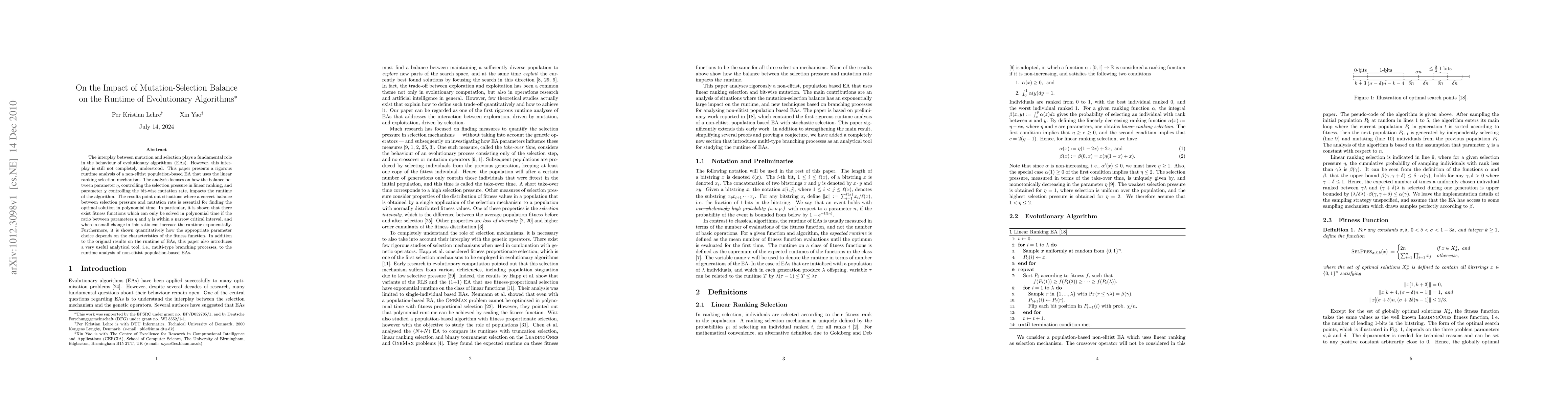 This paper rigorously analyzes the runtime of a non-elitist evolutionary algorithm using linear ranking selection, focusing on the impact of mutation-selection balance. It demonstrates that an optimal balance between selection pressure and mutation rate is crucial for achieving polynomial runtime, introducing multi-type branching processes as a new analytical tool for this analysis.