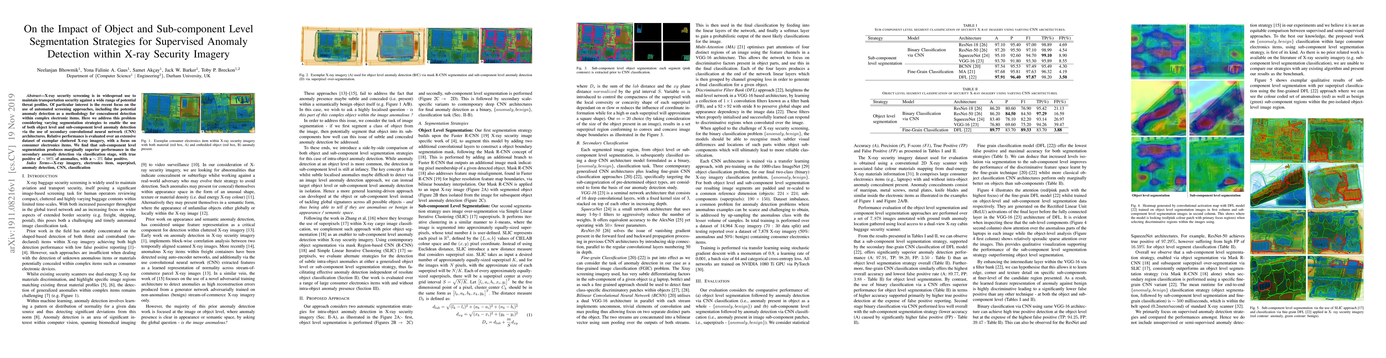 This paper investigates the effectiveness of object and sub-component level segmentation strategies for supervised anomaly detection in X-ray security screening. It finds that sub-component level segmentation yields marginally better results, achieving ~98% true positives for anomaly detection with a ~3% false positive rate.