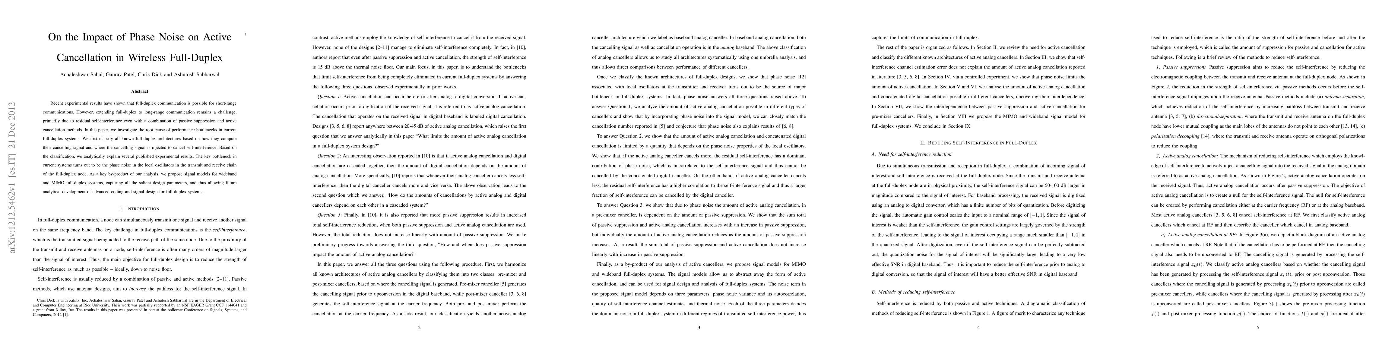 This paper investigates the impact of phase noise in local oscillators on active cancellation in wireless full-duplex communication, identifying it as a key bottleneck for long-range performance. It proposes new signal models for wideband and MIMO systems to facilitate future analytical development.