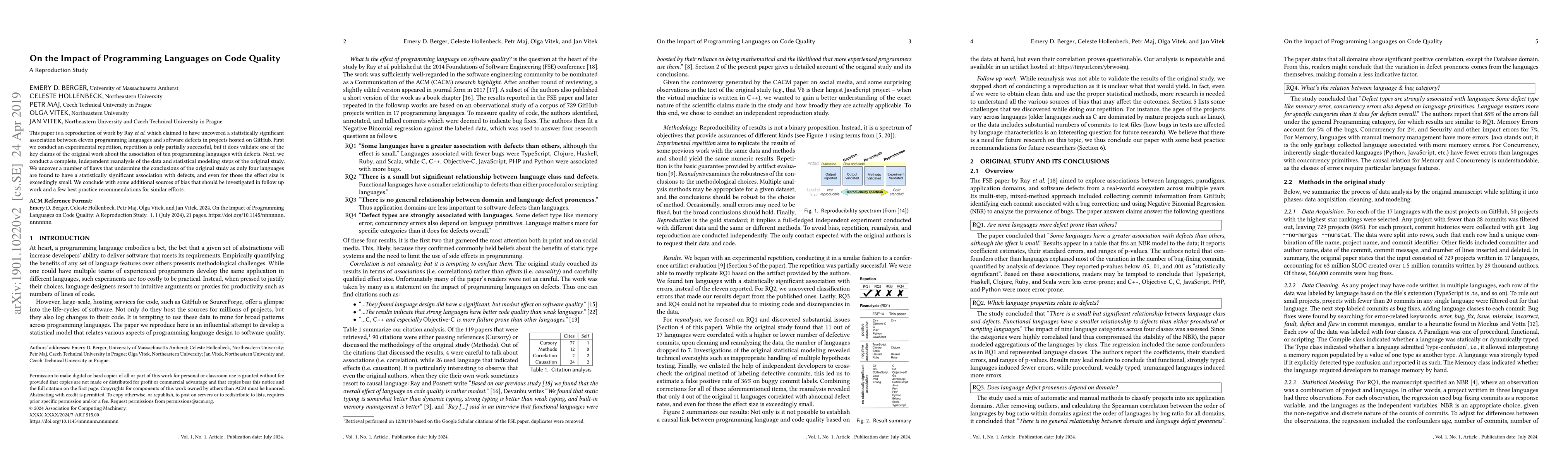 This paper is a reproduction of work by Ray et al. which claimed to have uncovered a statistically significant association between eleven programming languages and software defects in projects hosted on GitHub. First we conduct an experimental repetition, repetition is only partially successful, but it does validate one of the key claims of the original work about the association of ten programming languages with defects. Next, we conduct a complete, independent reanalysis of the data and statistical modeling steps of the original study. We uncover a number of flaws that undermine the conclusions of the original study as only four languages are found to have a statistically significant association with defects, and even for those the effect size is exceedingly small. We conclude with some additional sources of bias that should be investigated in follow up work and a few best practice recommendations for similar efforts.