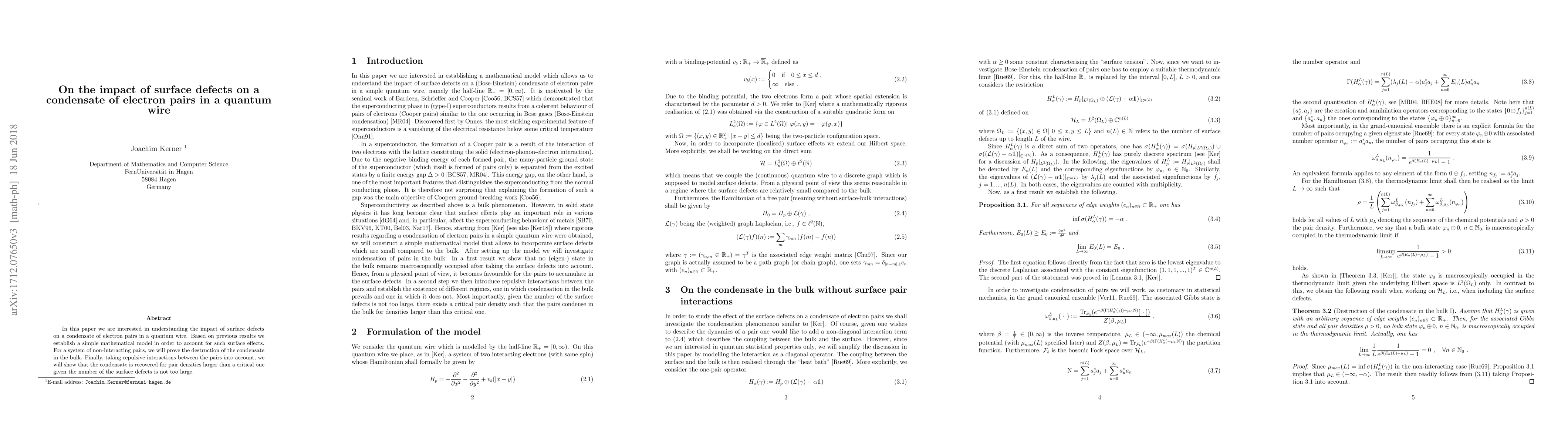 In this paper we are interested in understanding the impact of surface defects on a condensate of electron pairs in a quantum wire. Based on previous results we establish a simple mathematical model in order to account for such surface effects. For a system of non-interacting pairs, we will prove the destruction of the condensate in the bulk. Finally, taking repulsive interactions between the pairs into account, we will show that the condensate is recovered for pair densities larger than a critical one given the number of the surface defects is not too large.