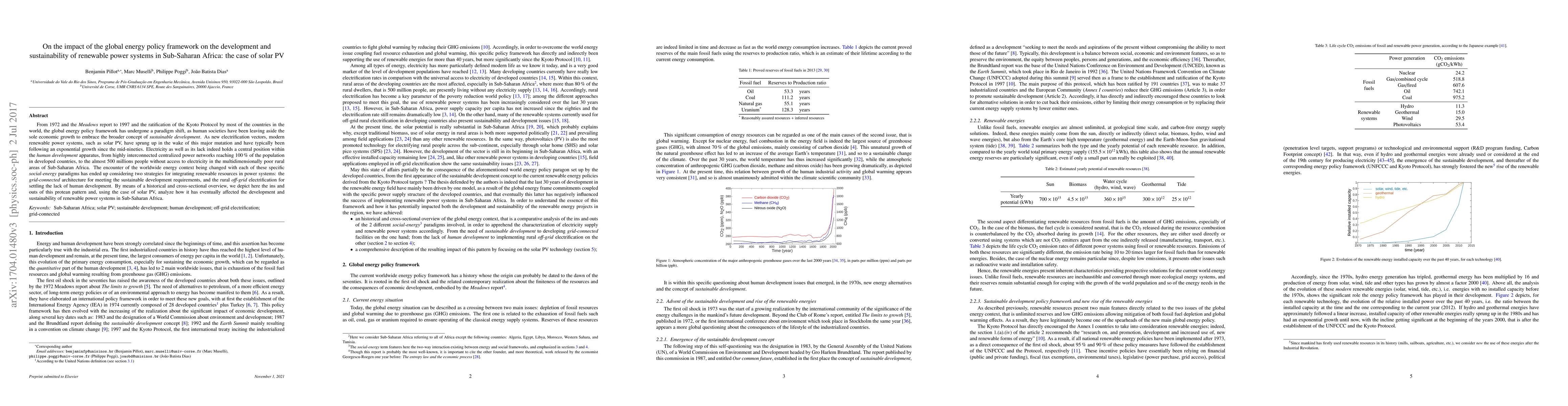 This paper examines the evolution of global energy policy frameworks and their influence on the development and sustainability of solar PV systems in Sub-Saharan Africa. It analyzes the transition from economic growth to sustainable development and highlights the role of solar PV in addressing both grid-connected and off-grid electrification needs in the region.