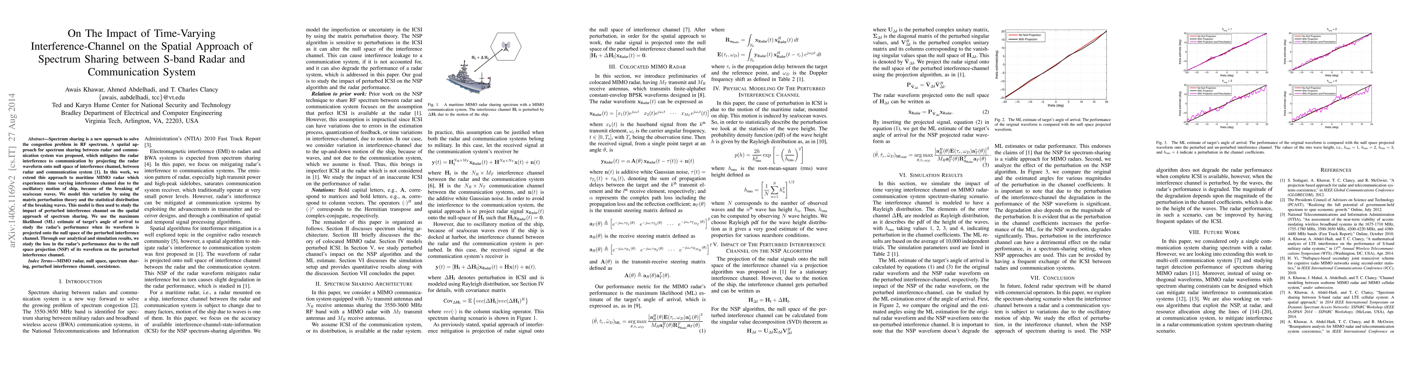 Spectrum sharing is a new approach to solve the congestion problem in the RF spectrum. A spatial approach for spectrum sharing between a radar and a communication system was proposed, which mitigates the radar interference to communication by projecting the radar waveform onto the null space of the interference channel, between radar and communication system [1]. In this work, we extend this approach to a maritime MIMO radar which experiences a time varying interference channel due to the oscillatory motion of a ship, because of the breaking of sea/ocean waves. We model this variation by using the matrix perturbation theory and the statistical distribution of the breaking waves. This model is then used to study the impact of perturbed interference channel on the spatial approach of spectrum sharing. We use the maximum likelihood (ML) estimate of a target's angle of arrival to study the radar's performance when its waveform is projected onto the null space of the perturbed interference channel. Through our analytical and simulation results, we study the loss in the radar's performance due to the null space projection (NSP) of its waveform on the perturbed interference channel.