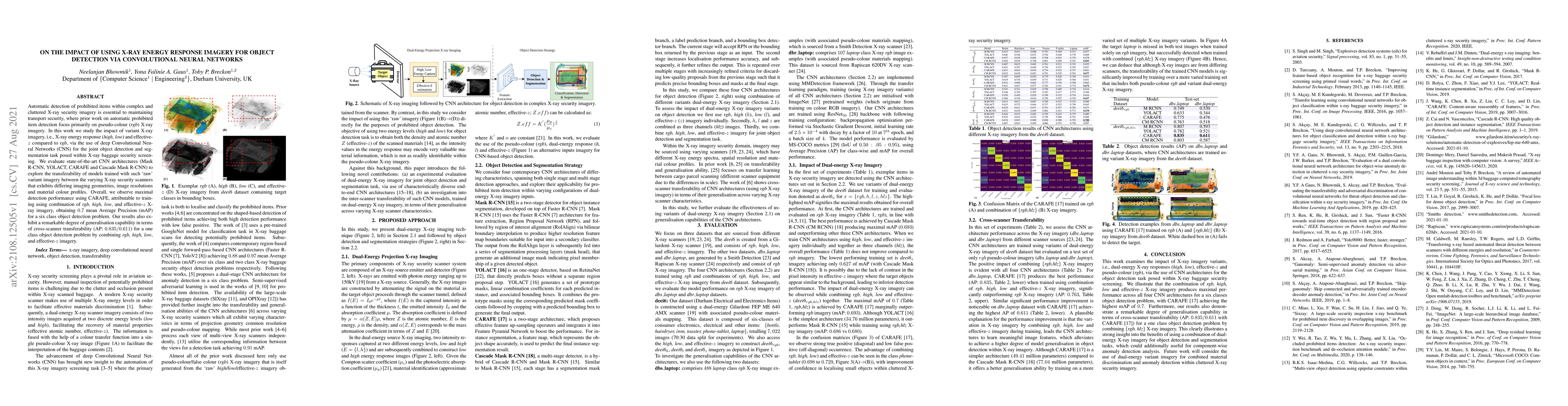 This research investigates the use of X-ray energy response imagery for detecting prohibited items in security screening via Convolutional Neural Networks (CNN). The study finds that combining high and low X-ray energy response imagery with effective-z and RGB imagery leads to optimal detection performance using CARAFE, achieving a 0.7 mean Average Precision (mAP) for six-class detection, and demonstrating strong cross-scanner transferability.