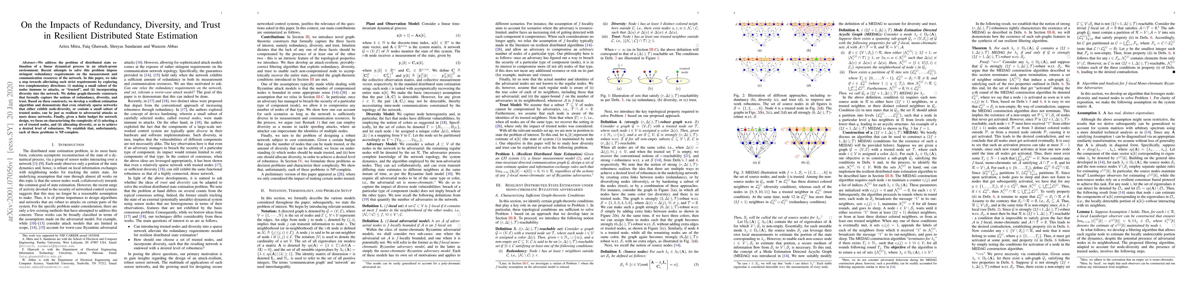 Researchers found that sparse networks with diverse nodes or small subsets of trusted nodes can be resilient to attacks, challenging traditional notions of redundancy in distributed state estimation. Selecting these nodes or allocating diversity is an NP-complete problem, but it provides new design options for robustness.