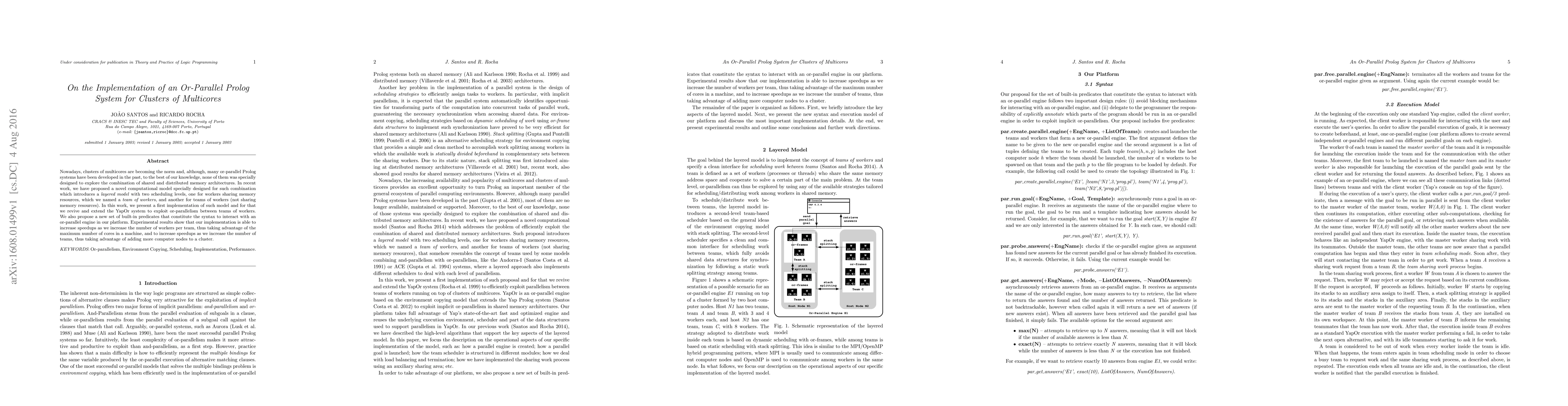 Researchers implemented an or-parallel Prolog system for clusters of multicores, increasing speedups with more workers per team and teams, leveraging shared and distributed memory architectures.