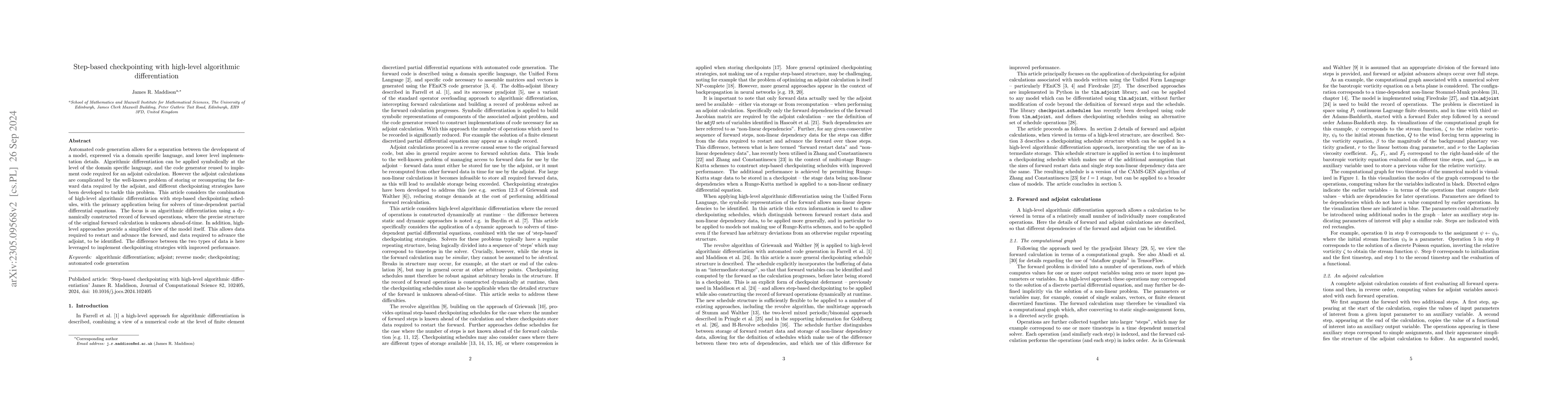 This paper explores the integration of checkpointing strategies with high-level algorithmic differentiation, leveraging automated code generation to simplify the model development and implementation. It proposes improved checkpointing methods that exploit the differences between forward and adjoint data to enhance performance.
