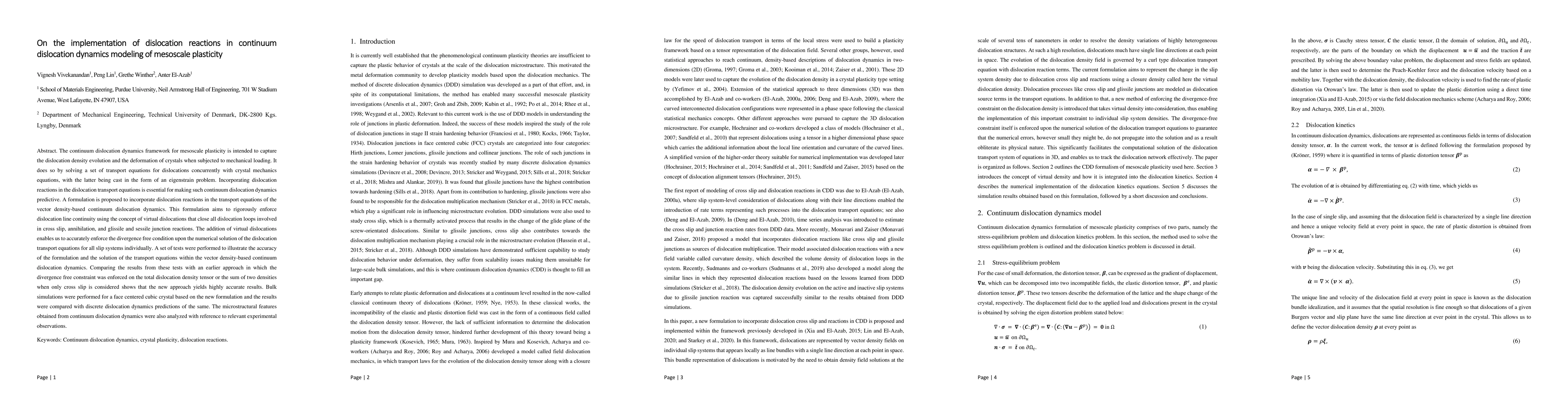 This paper proposes a new formulation for incorporating dislocation reactions in continuum dislocation dynamics modeling of mesoscale plasticity, using virtual dislocations to enforce line continuity and divergence-free conditions. The new approach shows improved accuracy compared to previous methods, as demonstrated through bulk simulations and comparison with discrete dislocation dynamics and experimental observations.