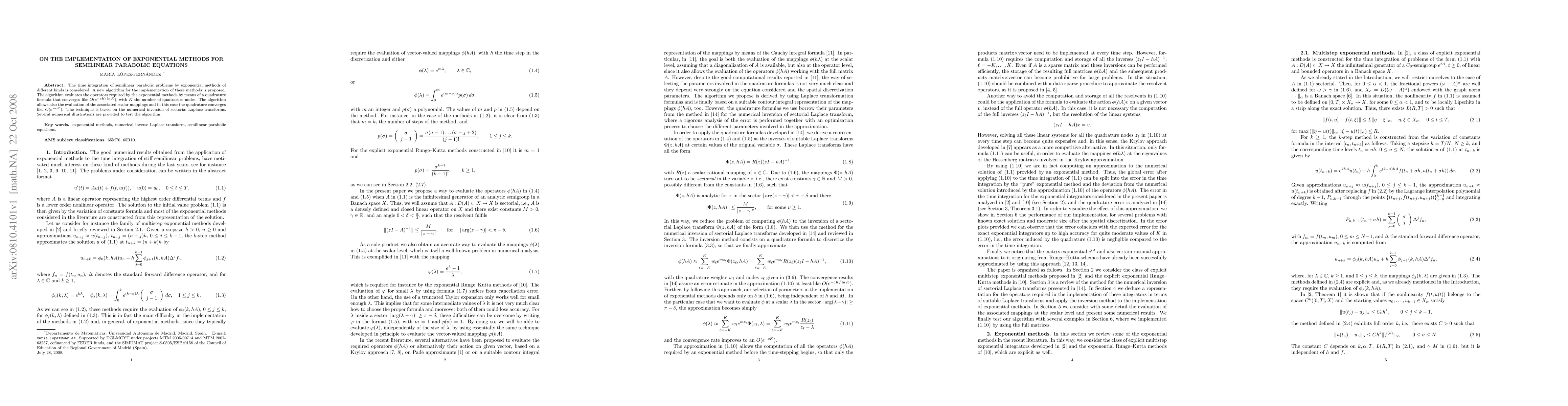 This paper proposes a new algorithm for implementing exponential methods to solve semilinear parabolic equations, utilizing a quadrature formula for operator evaluation that converges exponentially with the number of nodes. The technique involves numerical inversion of sectorial Laplace transforms and is validated with numerical examples.