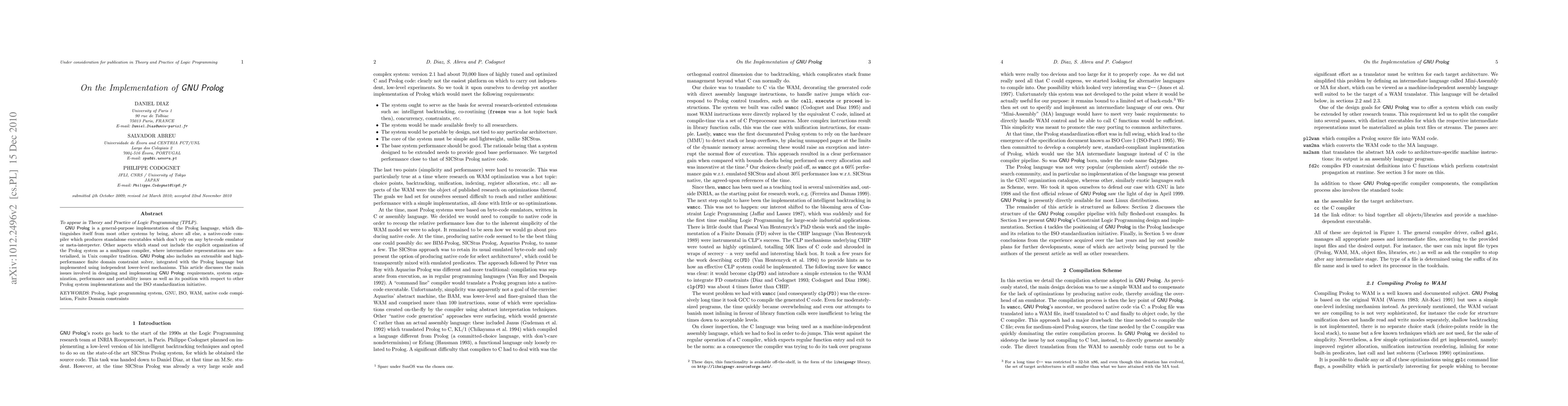 This paper details the implementation of GNU Prolog, emphasizing its unique native-code compiler that produces standalone executables and its multipass compiler structure. It also highlights the integrated high-performance constraint solver and discusses the design, performance, and positioning of GNU Prolog relative to other Prolog systems.