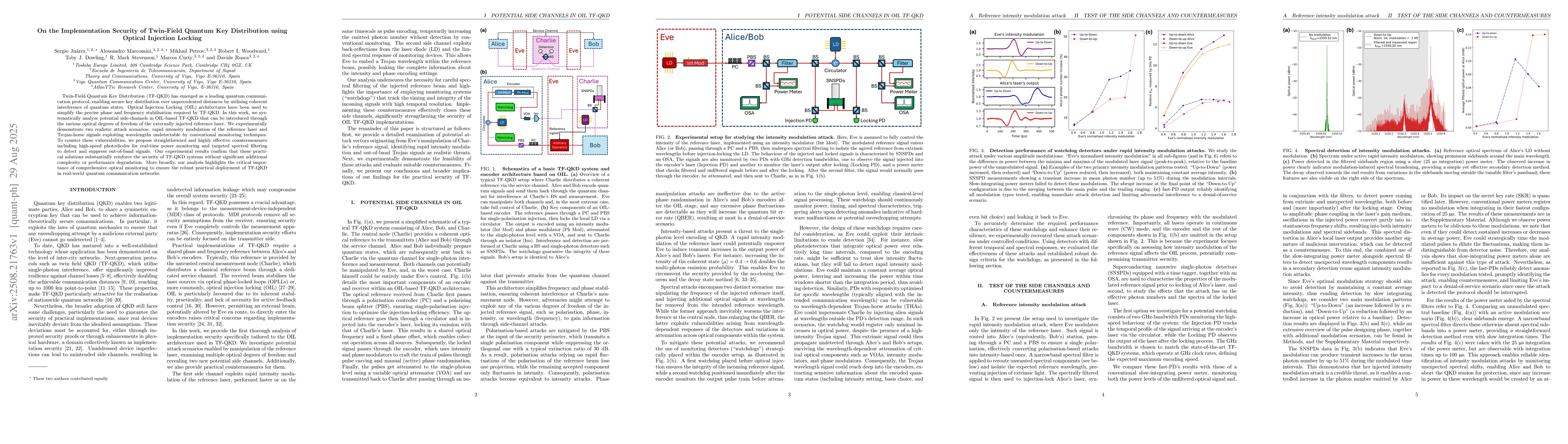 Twin-Field Quantum Key Distribution (TF-QKD) has emerged as a leading quantum communication protocol, enabling secure key distribution over unprecedented distances by utilising coherent interference of quantum states. Optical Injection Locking (OIL) architectures have been used to simplify the precise phase and frequency stabilisation required by TF-QKD. In this work, we systematically analyse potential side-channels in OIL-based TF-QKD that can be introduced through the various optical degrees of freedom of the externally injected reference laser. We experimentally demonstrate two realistic attack scenarios: rapid intensity modulation of the reference laser and Trojan-horse signals exploiting wavelengths undetectable by conventional monitoring techniques. To counter these vulnerabilities, we propose straightforward and highly effective countermeasures including high-speed photodiodes for real-time power monitoring and targeted spectral filtering to detect and suppress out-of-band signals. Our experimental results confirm that these practical solutions substantially reinforce the security of TF-QKD systems without significant additional complexity or performance degradation. More broadly, our analysis highlights the critical importance of comprehensive optical monitoring to ensure the robust practical deployment of TF-QKD in real-world quantum communication networks.