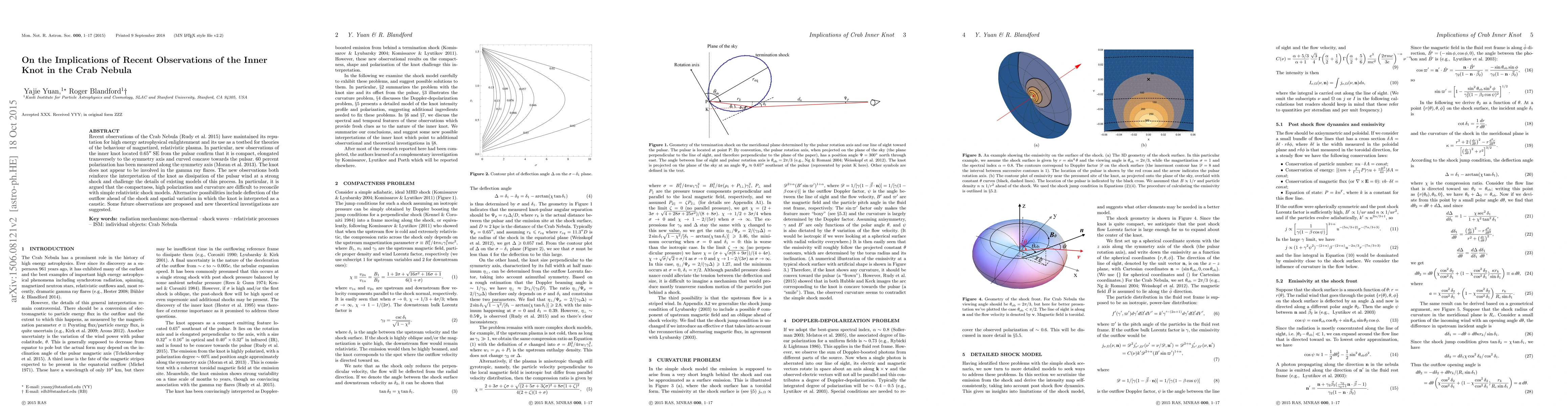 Recent observations of the Crab Nebula (Rudy et al 2015) have maintained its reputation for high energy astrophysical enlightenment and its use as a testbed for theories of the behaviour of magnetized, relativistic plasma. In particular, new observations of the inner knot located 0.65" SE from the pulsar confirm that it is compact, elongated transversely to the symmetry axis and curved concave towards the pulsar. 60 percent polarization has been measured along the symmetry axis (Moran et al 2013). The knot does not appear to be involved in the gamma ray flares. The new observations both reinforce the interpretation of the knot as dissipation of the pulsar wind at a strong shock and challenge the details of existing models of this process. In particular, it is argued that the compactness, high polarization and curvature are difficult to reconcile with simple relativistic shock models. Alternative possibilities include deflection of the outflow ahead of the shock and spatial variation in which the knot is interpreted as a caustic. Some future observations are proposed and new theoretical investigations are suggested.