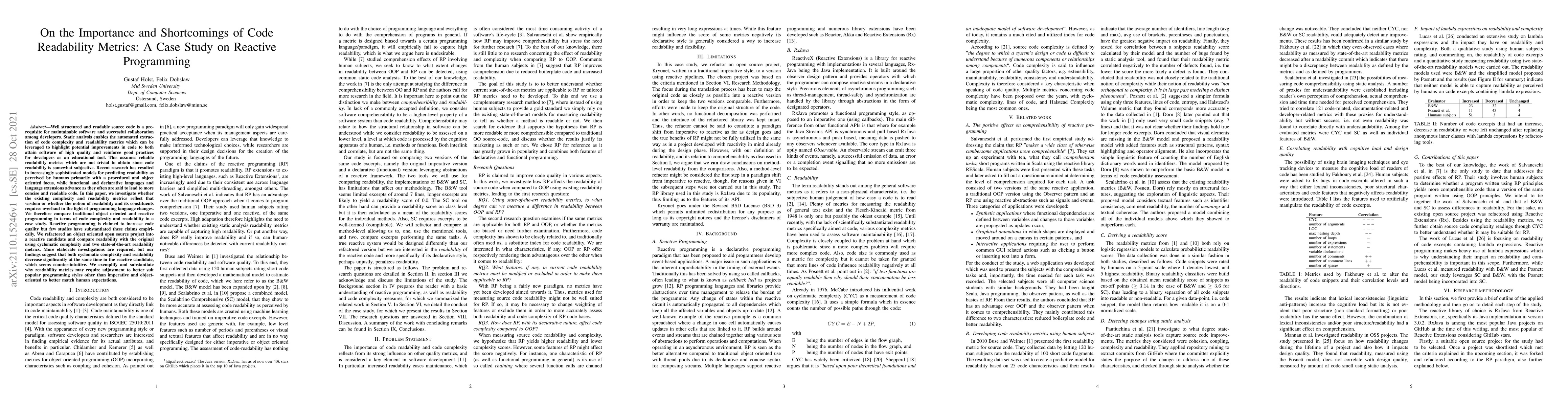 Well structured and readable source code is a pre-requisite for maintainable software and successful collaboration among developers. Static analysis enables the automated extraction of code complexity and readability metrics which can be leveraged to highlight potential improvements in code to both attain software of high quality and reinforce good practices for developers as an educational tool. This assumes reliable readability metrics which are not trivial to obtain since code readability is somewhat subjective. Recent research has resulted in increasingly sophisticated models for predicting readability as perceived by humans primarily with a procedural and object oriented focus, while functional and declarative languages and language extensions advance as they often are said to lead to more concise and readable code. In this paper, we investigate whether the existing complexity and readability metrics reflect that wisdom or whether the notion of readability and its constituents requires overhaul in the light of programming language changes. We therefore compare traditional object oriented and reactive programming in terms of code complexity and readability in a case study. Reactive programming is claimed to increase code quality but few studies have substantiated these claims empirically. We refactored an object oriented open source project into a reactive candidate and compare readability with the original using cyclomatic complexity and two state-of-the-art readability metrics. More elaborate investigations are required, but our findings suggest that both cyclomatic complexity and readability decrease significantly at the same time in the reactive candidate, which seems counter-intuitive. We exemplify and substantiate why readability metrics may require adjustment to better suit popular programming styles other than imperative and object-oriented to better match human expectations.