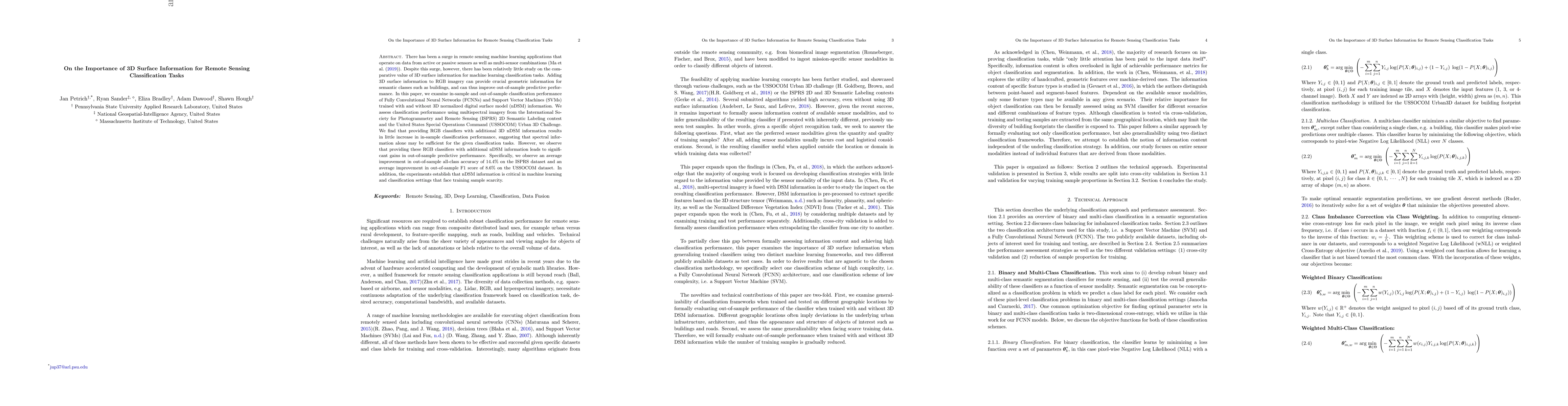 There has been a surge in remote sensing machine learning applications that operate on data from active or passive sensors as well as multi-sensor combinations (Ma et al. (2019)). Despite this surge, however, there has been relatively little study on the comparative value of 3D surface information for machine learning classification tasks. Adding 3D surface information to RGB imagery can provide crucial geometric information for semantic classes such as buildings, and can thus improve out-of-sample predictive performance. In this paper, we examine in-sample and out-of-sample classification performance of Fully Convolutional Neural Networks (FCNNs) and Support Vector Machines (SVMs) trained with and without 3D normalized digital surface model (nDSM) information. We assess classification performance using multispectral imagery from the International Society for Photogrammetry and Remote Sensing (ISPRS) 2D Semantic Labeling contest and the United States Special Operations Command (USSOCOM) Urban 3D Challenge. We find that providing RGB classifiers with additional 3D nDSM information results in little increase in in-sample classification performance, suggesting that spectral information alone may be sufficient for the given classification tasks. However, we observe that providing these RGB classifiers with additional nDSM information leads to significant gains in out-of-sample predictive performance. Specifically, we observe an average improvement in out-of-sample all-class accuracy of 14.4% on the ISPRS dataset and an average improvement in out-of-sample F1 score of 8.6% on the USSOCOM dataset. In addition, the experiments establish that nDSM information is critical in machine learning and classification settings that face training sample scarcity.