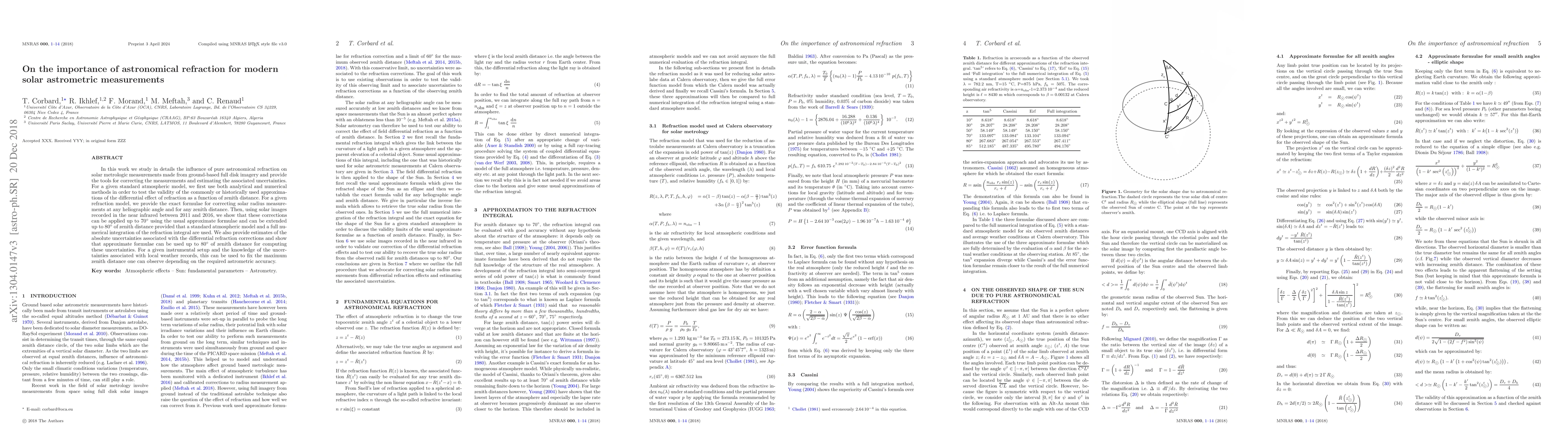 In this work we study in details the influence of pure astronomical refraction on solar metrologic measurements made from ground-based full disk imagery and provide the tools for correcting the measurements and estimating the associated uncertainties.For a given standard atmospheric model, we first use both analytical and numerical methods in order to test the validity of the commonly or historically used approximations of the differential effect of refraction as a function of zenith distance. For a given refraction model, we provide the exact formulae for correcting solar radius measurements at any heliographic angle and for any zenith distance. Then, using solar images recorded in the near infrared between 2011 and 2016, we show that these corrections can be applied up to $70\deg$ using the usual approximate formulae and can be extended up to $80\deg$ of zenith distance provided that a standard atmospheric model and a full numerical integration of the refraction integral are used. We also provide estimates of the absolute uncertainties associated with the differential refraction corrections and show that approximate formulae can be used up to $80\deg$ of zenith distance for computing these uncertainties. For a given instrumental setup and the knowledge of the uncertainties associated with local weather records, this can be used to fix the maximum zenith distance one can observe depending on the required astrometric accuracy.