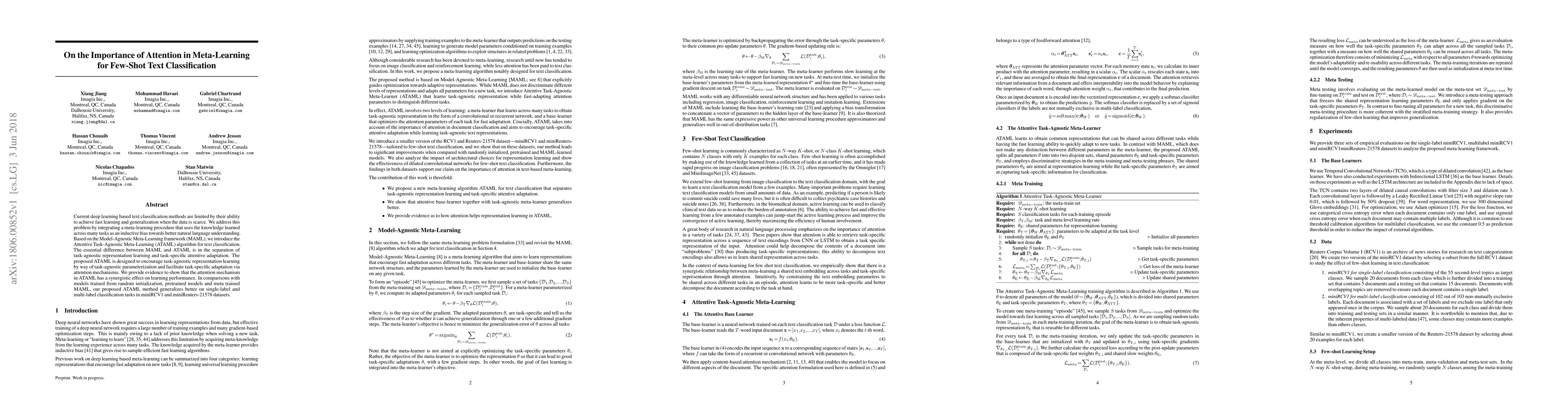 Current deep learning based text classification methods are limited by their ability to achieve fast learning and generalization when the data is scarce. We address this problem by integrating a meta-learning procedure that uses the knowledge learned across many tasks as an inductive bias towards better natural language understanding. Based on the Model-Agnostic Meta-Learning framework (MAML), we introduce the Attentive Task-Agnostic Meta-Learning (ATAML) algorithm for text classification. The essential difference between MAML and ATAML is in the separation of task-agnostic representation learning and task-specific attentive adaptation. The proposed ATAML is designed to encourage task-agnostic representation learning by way of task-agnostic parameterization and facilitate task-specific adaptation via attention mechanisms. We provide evidence to show that the attention mechanism in ATAML has a synergistic effect on learning performance. In comparisons with models trained from random initialization, pretrained models and meta trained MAML, our proposed ATAML method generalizes better on single-label and multi-label classification tasks in miniRCV1 and miniReuters-21578 datasets.