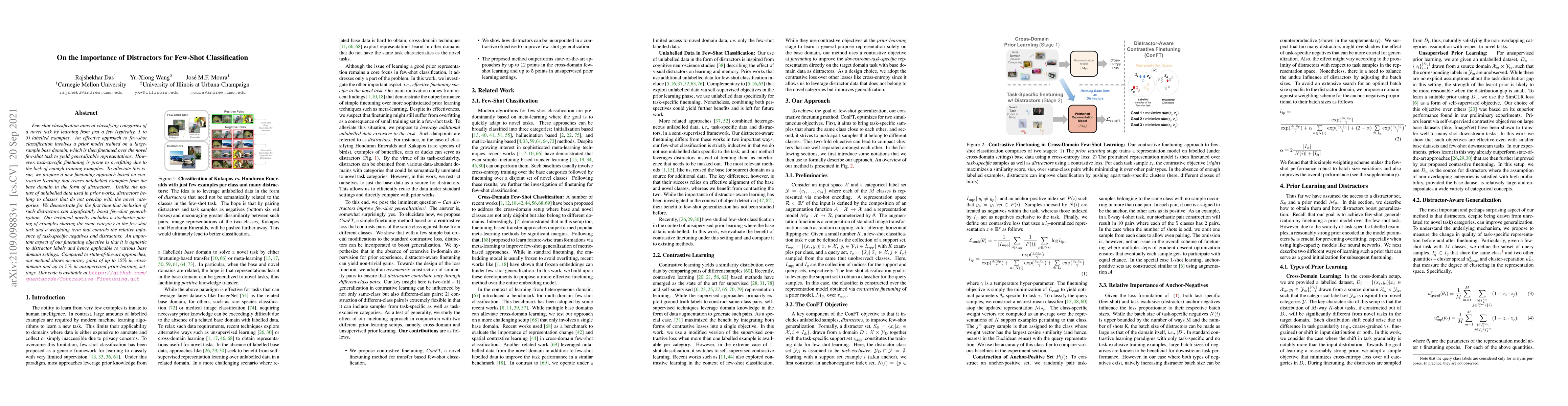 This paper proposes a novel finetuning approach for few-shot classification that leverages unlabelled examples from the base domain as distractors to improve generalization. The method uses contrastive learning to pair examples and includes a weighting term to balance task-specific negatives and distractors, achieving significant accuracy gains over state-of-the-art methods.