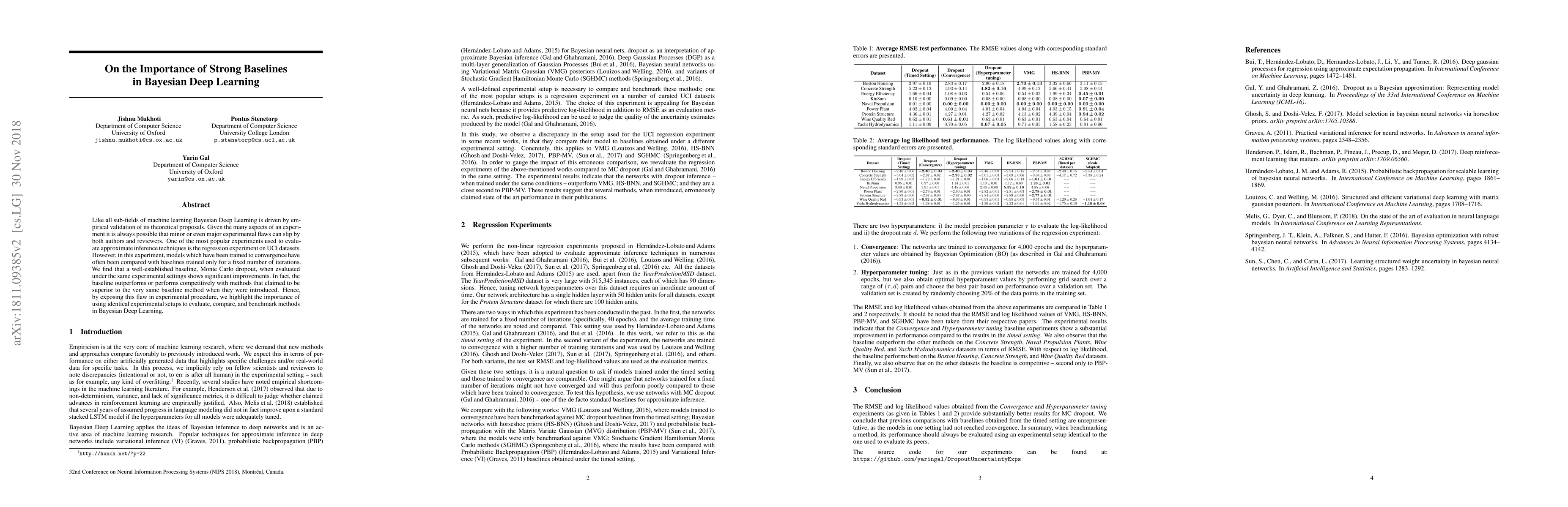 Like all sub-fields of machine learning Bayesian Deep Learning is driven by empirical validation of its theoretical proposals. Given the many aspects of an experiment it is always possible that minor or even major experimental flaws can slip by both authors and reviewers. One of the most popular experiments used to evaluate approximate inference techniques is the regression experiment on UCI datasets. However, in this experiment, models which have been trained to convergence have often been compared with baselines trained only for a fixed number of iterations. We find that a well-established baseline, Monte Carlo dropout, when evaluated under the same experimental settings shows significant improvements. In fact, the baseline outperforms or performs competitively with methods that claimed to be superior to the very same baseline method when they were introduced. Hence, by exposing this flaw in experimental procedure, we highlight the importance of using identical experimental setups to evaluate, compare, and benchmark methods in Bayesian Deep Learning.