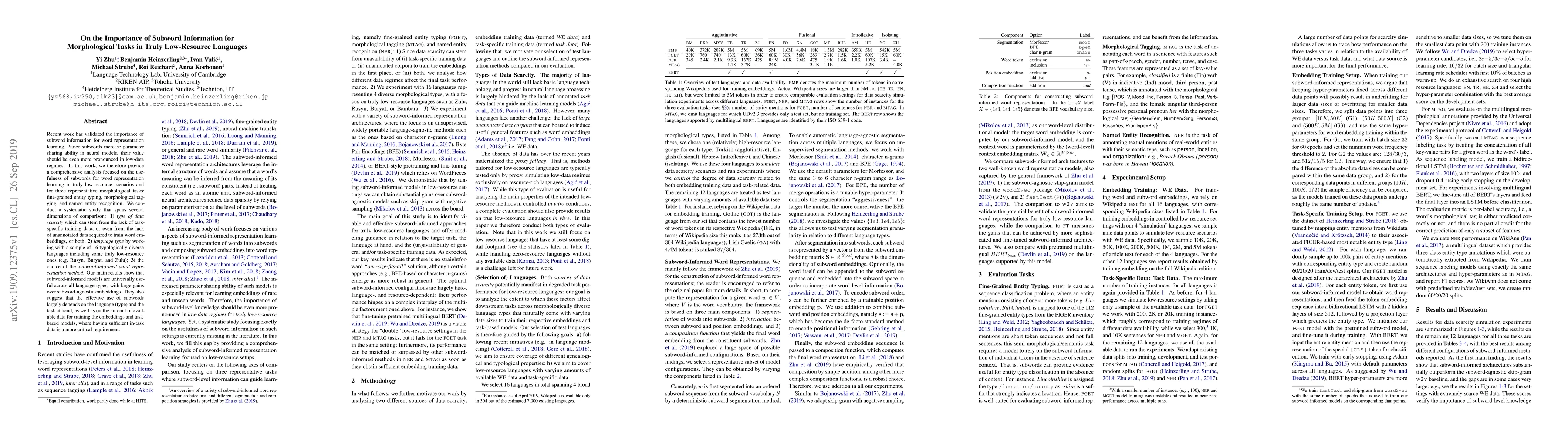 Recent work has validated the importance of subword information for word representation learning. Since subwords increase parameter sharing ability in neural models, their value should be even more pronounced in low-data regimes. In this work, we therefore provide a comprehensive analysis focused on the usefulness of subwords for word representation learning in truly low-resource scenarios and for three representative morphological tasks: fine-grained entity typing, morphological tagging, and named entity recognition. We conduct a systematic study that spans several dimensions of comparison: 1) type of data scarcity which can stem from the lack of task-specific training data, or even from the lack of unannotated data required to train word embeddings, or both; 2) language type by working with a sample of 16 typologically diverse languages including some truly low-resource ones (e.g. Rusyn, Buryat, and Zulu); 3) the choice of the subword-informed word representation method. Our main results show that subword-informed models are universally useful across all language types, with large gains over subword-agnostic embeddings. They also suggest that the effective use of subwords largely depends on the language (type) and the task at hand, as well as on the amount of available data for training the embeddings and task-based models, where having sufficient in-task data is a more critical requirement.
