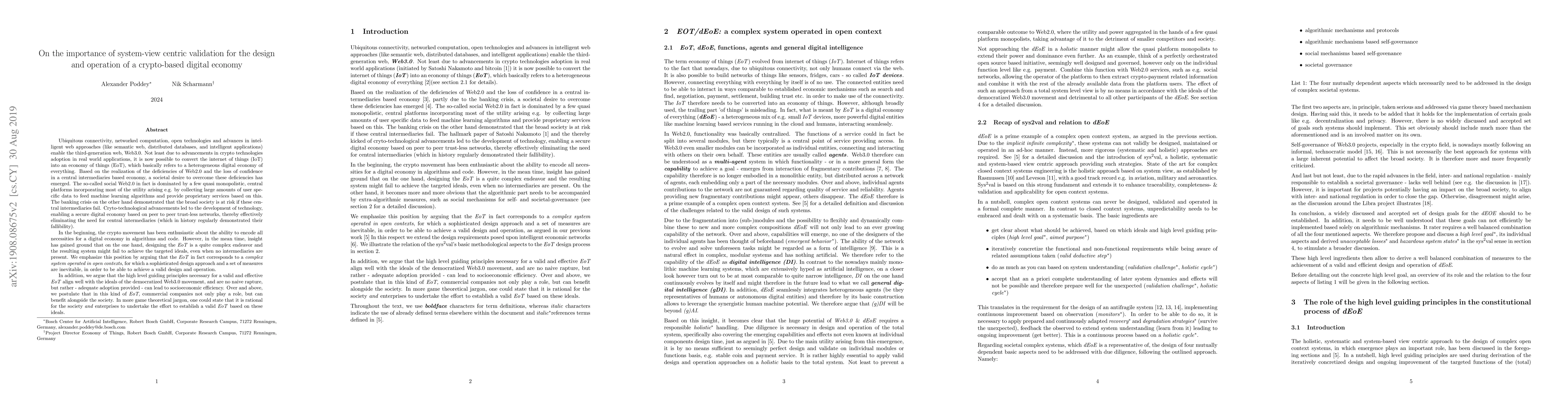 This paper argues that system-view centric validation is crucial for designing and operating a crypto-based digital economy, termed the Economy of Things (EoT). It highlights the complexity of achieving socioeconomic efficiency in a decentralized Web3.0 environment and posits that commercial entities can benefit alongside society when these principles are adequately adopted.