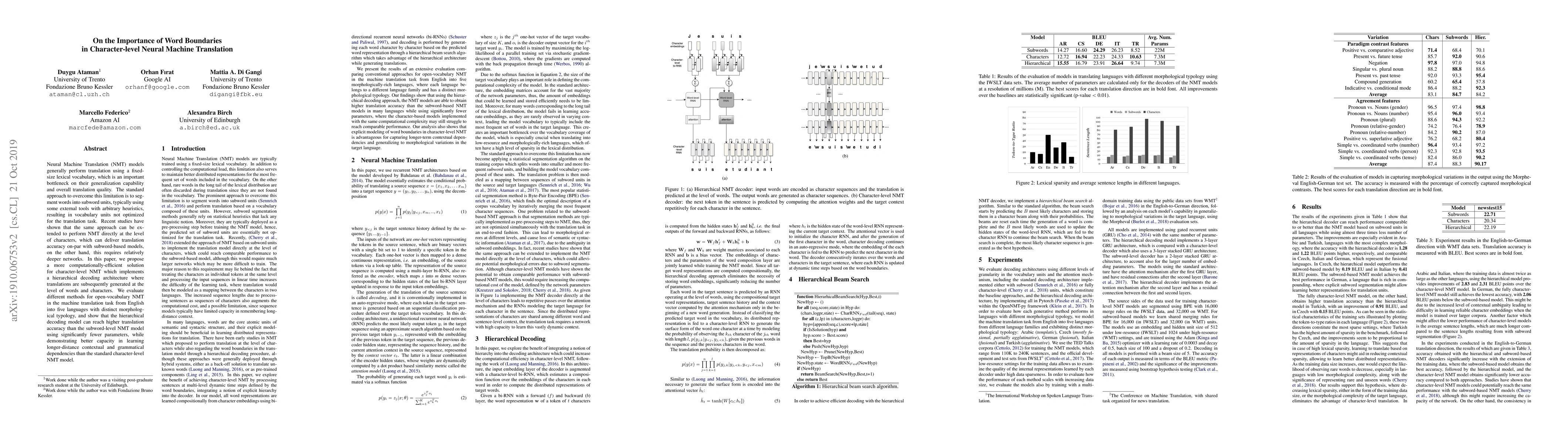 This paper proposes a hierarchical decoding architecture for character-level Neural Machine Translation (NMT) that generates translations at word and character levels, achieving higher translation accuracy with fewer parameters compared to subword-level NMT models. The approach demonstrates better contextual and grammatical dependency learning.