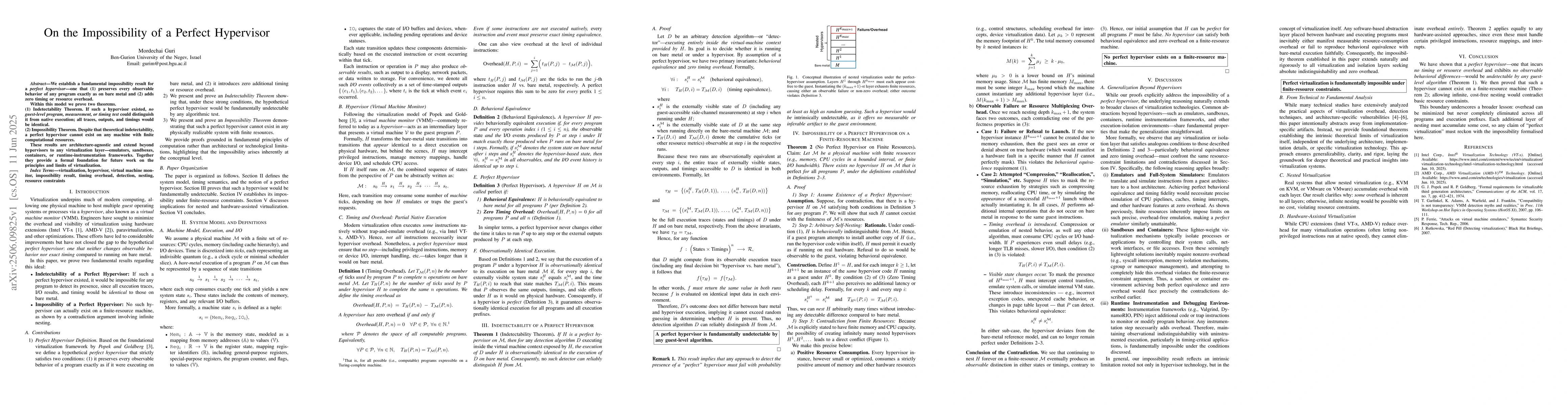 The research establishes impossibility results for a 'perfect hypervisor' through formal theorems and architecture-agnostic arguments.
