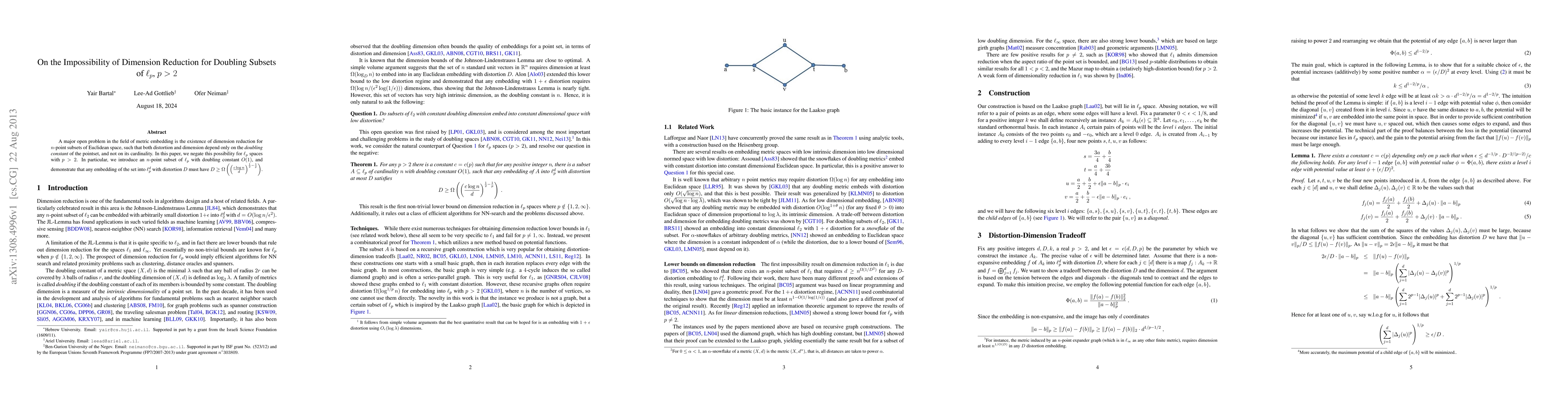 This paper proves that dimension reduction for $n$-point subsets of $\ell_p$ spaces with $p>2$ is impossible, as any embedding into $\ell_p^d$ must have distortion scaling with $\Omega\left(\left(\frac{c\log n}{d}\right)^{\frac{1}{2}-\frac{1}{p}}\right)$. This result negates the possibility of achieving dimension reduction solely based on the doubling constant.