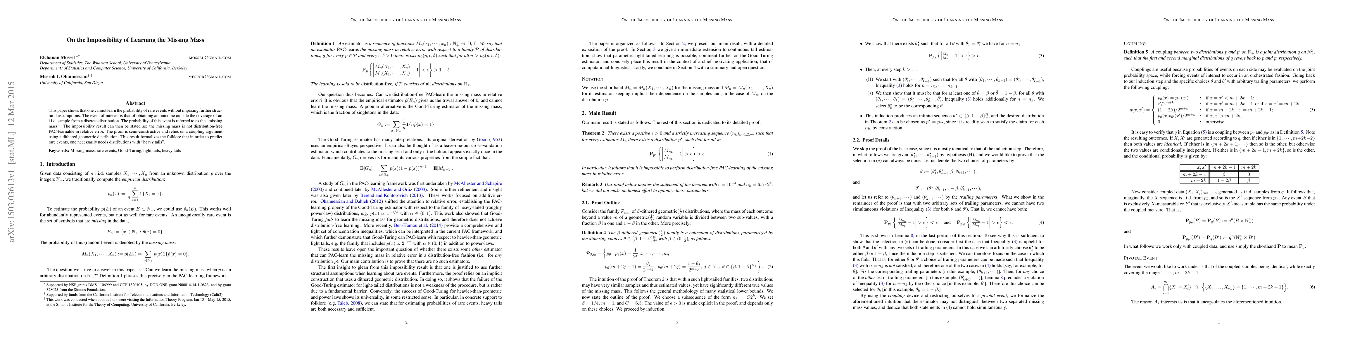 This research proves that predicting rare events' probabilities, or 'missing mass', from a discrete distribution's sample is impossible without additional assumptions. The proof uses a coupling argument with a dithered geometric distribution, showing that 'heavy tails' in distributions are necessary for such predictions.