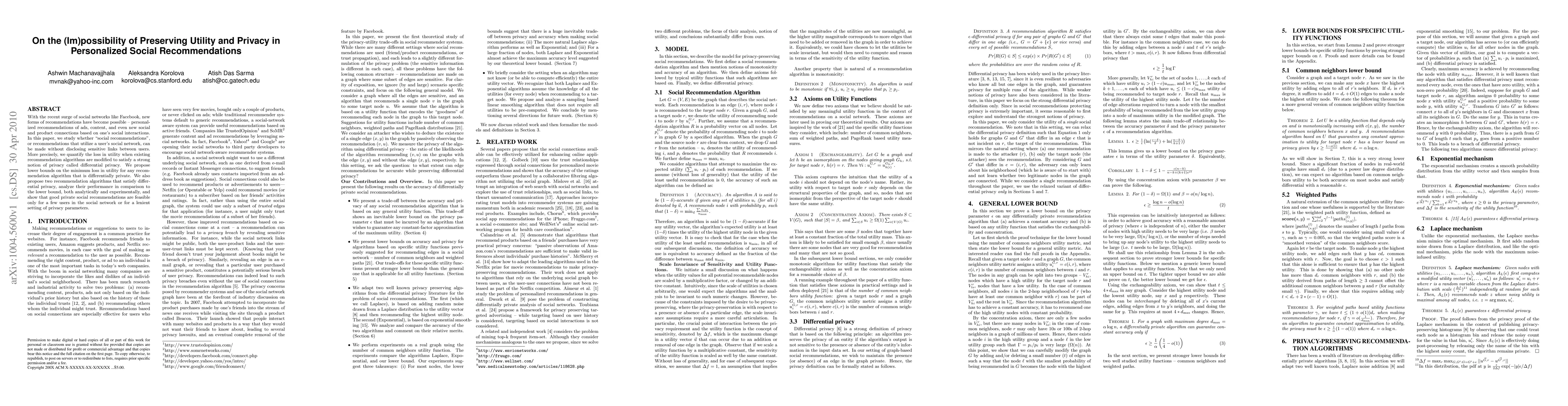 This paper investigates the trade-off between utility and privacy in personalized social recommendations, proposing that while differential privacy can be maintained, it results in significant utility loss. The authors introduce algorithms that achieve differential privacy and demonstrate that feasible private recommendations are limited to a few users or less stringent privacy settings.