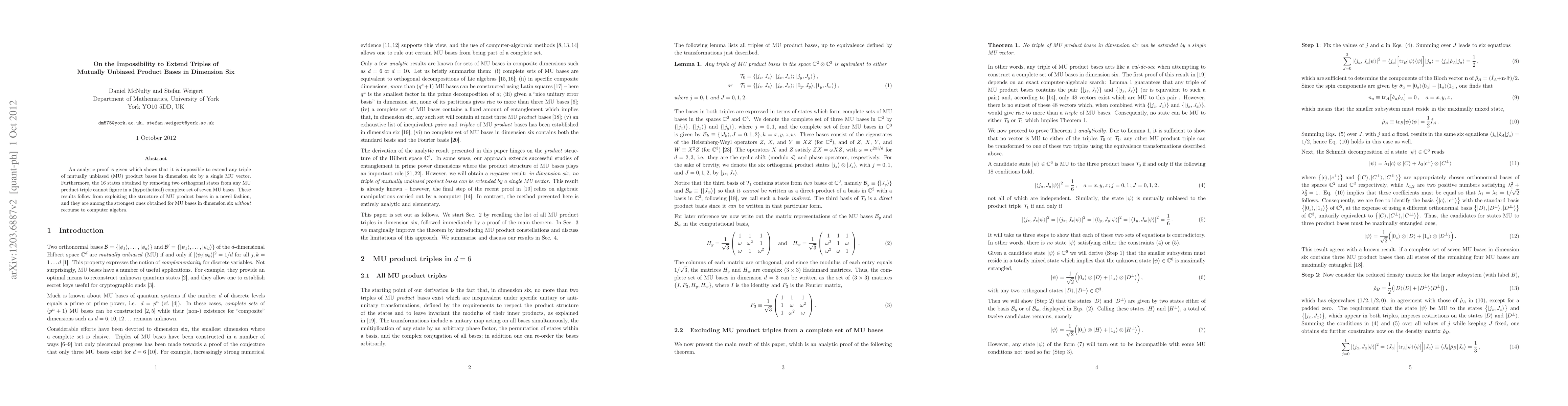 An analytic proof is given which shows that it is impossible to extend any triple of mutually unbiased (MU) product bases in dimension six by a single MU vector. Furthermore, the 16 states obtained by removing two orthogonal states from any MU product triple cannot figure in a (hypothetical) complete set of seven MU bases. These results follow from exploiting the structure of MU product bases in a novel fashion, and they are among the strongest ones obtained for MU bases in dimension six without recourse to computer algebra.