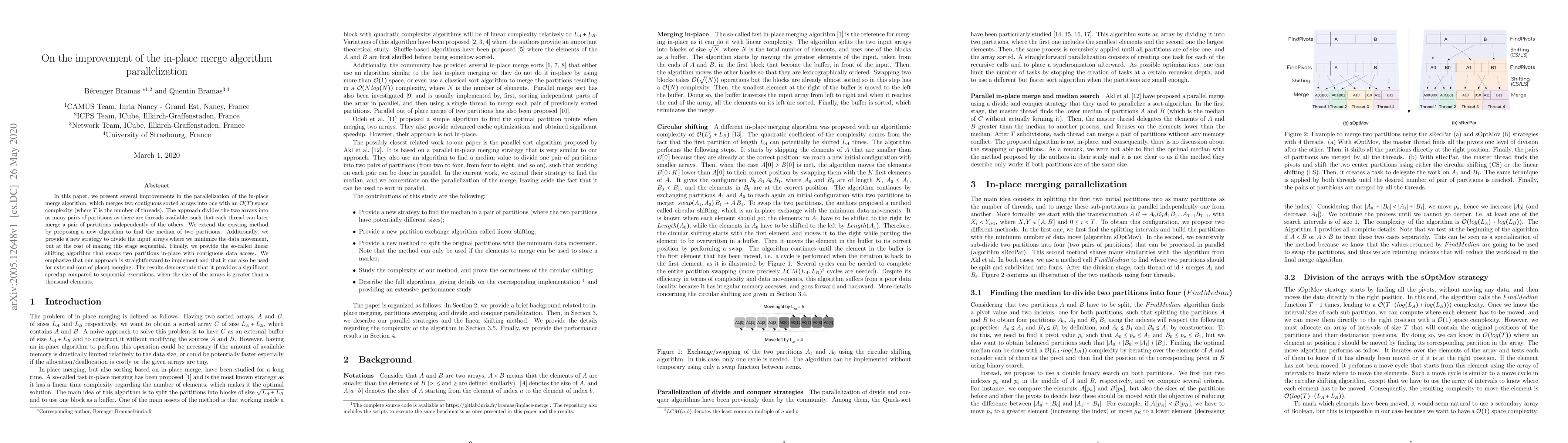 In this paper, we present several improvements in the parallelization of the in-place merge algorithm, which merges two contiguous sorted arrays into one with an O(T) space complexity (where T is the number of threads). The approach divides the two arrays into as many pairs of partitions as there are threads available; such that each thread can later merge a pair of partitions independently of the others. We extend the existing method by proposing a new algorithm to find the median of two partitions. Additionally, we provide a new strategy to divide the input arrays where we minimize the data movement, but at the cost of making this stage sequential. Finally, we provide the so-called linear shifting algorithm that swaps two partitions in-place with contiguous data access. We emphasize that our approach is straightforward to implement and that it can also be used for external (out of place) merging. The results demonstrate that it provides a significant speedup compared to sequential executions, when the size of the arrays is greater than a thousand elements.