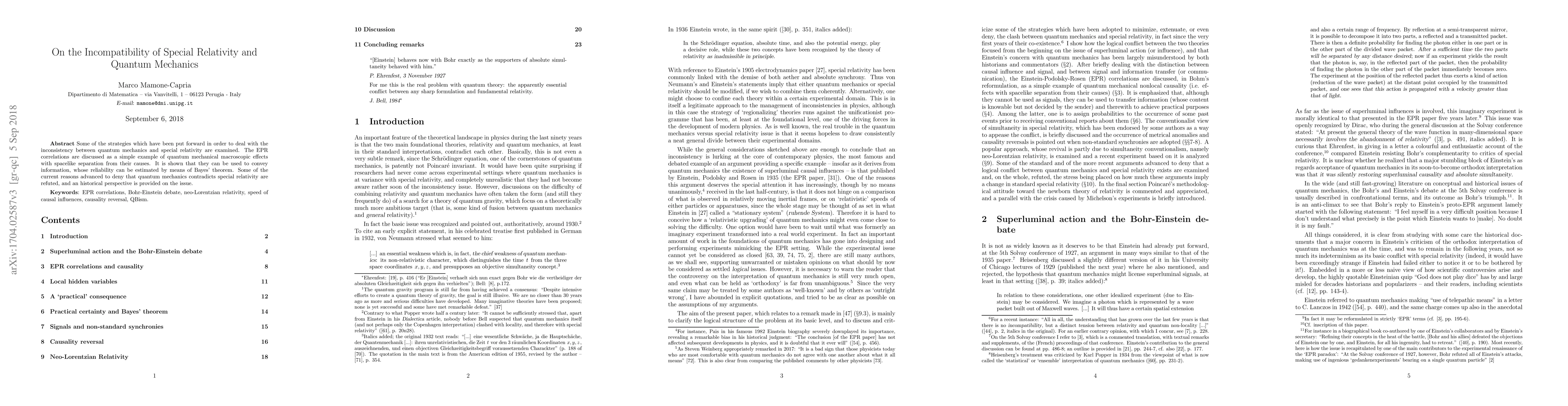 Some of the strategies which have been put forward in order to deal with the inconsistency between quantum mechanics and special relativity are examined. The EPR correlations are discussed as a simple example of quantum mechanical macroscopic effects with spacelike separation from their causes. It is shown that they can be used to convey information, whose reliability can be estimated by means of Bayes' theorem. Some of the current reasons advanced to deny that quantum mechanics contradicts special relativity are refuted, and an historical perspective is provided on the issue.