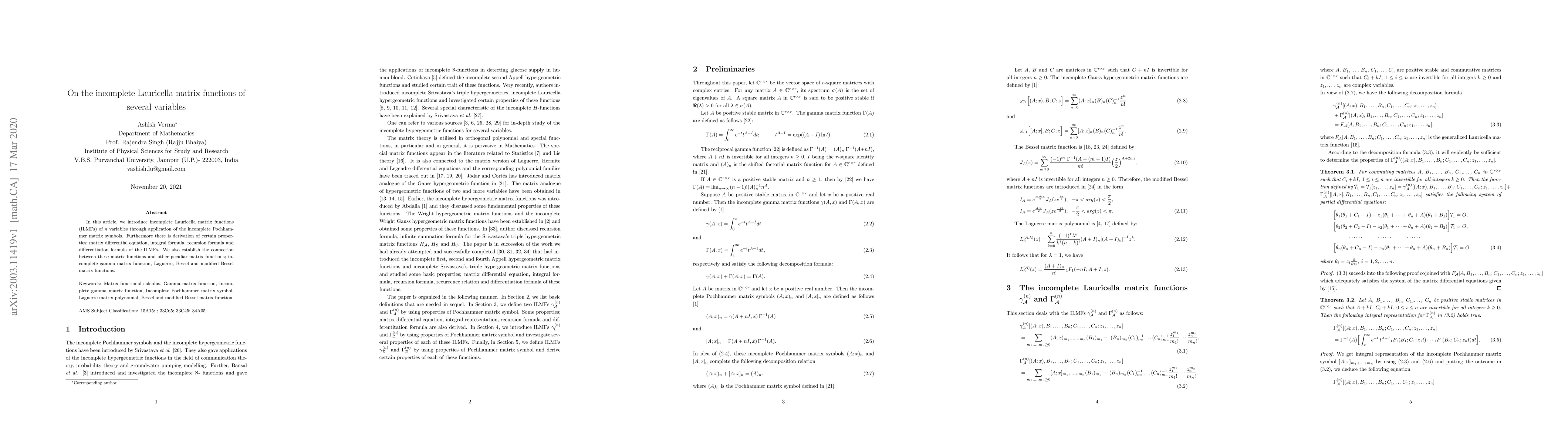 This paper introduces incomplete Lauricella matrix functions (ILMFs) of $n$ variables using incomplete Pochhammer matrix symbols, and derives properties including a matrix differential equation, integral formula, recursion formula, and differentiation formula. It also connects ILMFs to other matrix functions like incomplete gamma, Laguerre, Bessel, and modified Bessel matrix functions.