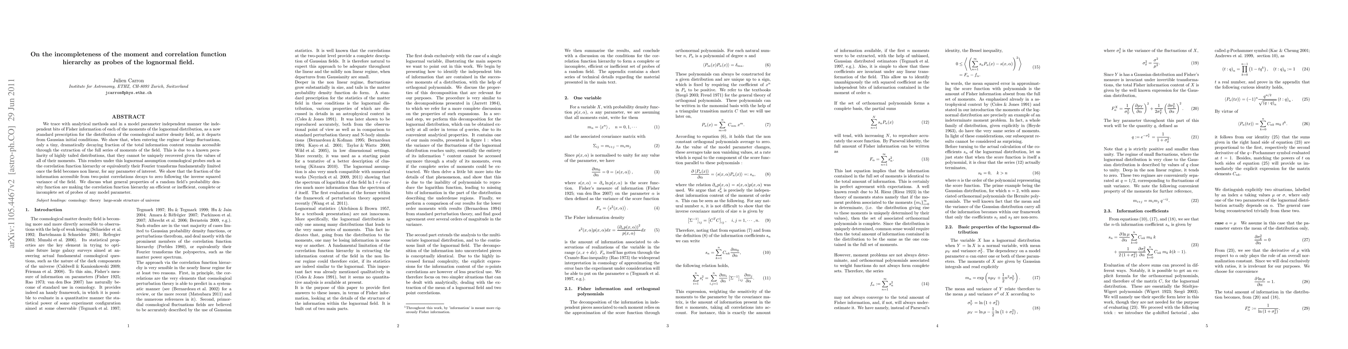 We trace with analytical methods and in a model parameter independent manner the independent bits of Fisher information of each of the moments of the lognormal distribution, as a now standard prescription for the distribution of the cosmological matter density field, as it departs from Gaussian initial conditions. We show that, when entering the regime of large fluctuations, only a tiny, dramatically decaying fraction of the total information content remains accessible through the extraction of the full series of moments of the field. This is due to a known peculiarity of highly tailed distributions, that they cannot be uniquely recovered given the values of all of their moments. This renders under this lognormal assumption cosmological probes such as the correlation function hierarchy or equivalently their Fourier transforms fundamentally limited once the field becomes non linear, for any parameter of interest. We show that the fraction of the information accessible from two-point correlations decays to zero following the inverse squared variance of the field. We discuss what general properties of a random field's probability density function are making the correlation function hierarchy an efficient or inefficient, complete or incomplete set of probes of any model parameter.