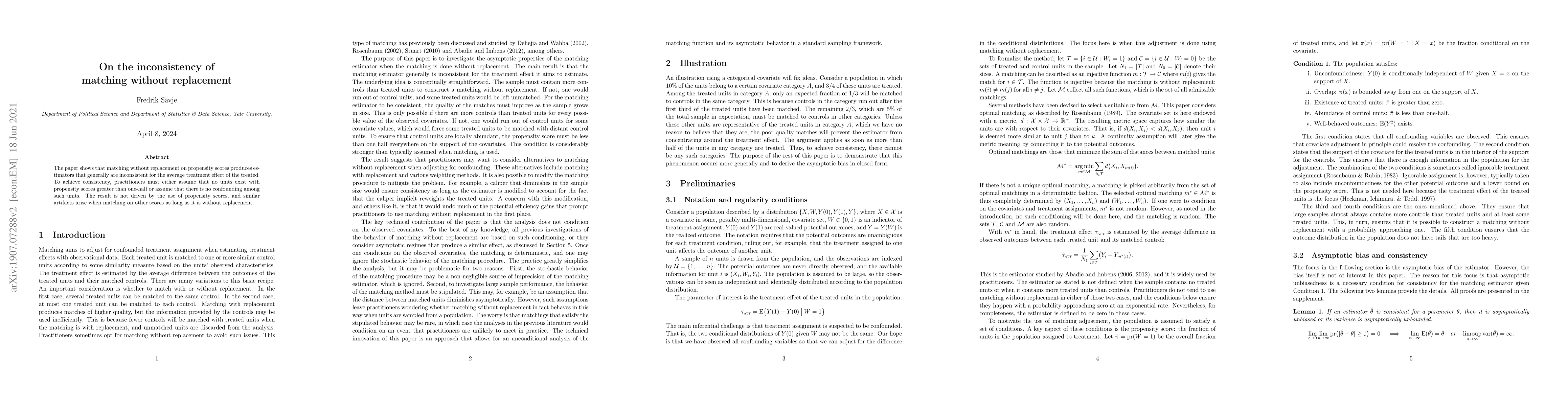 The paper demonstrates that matching without replacement on propensity scores leads to inconsistent estimators for the average treatment effect of the treated. To achieve consistency, one must assume no units with propensity scores above 0.5 or no confounding among such units.