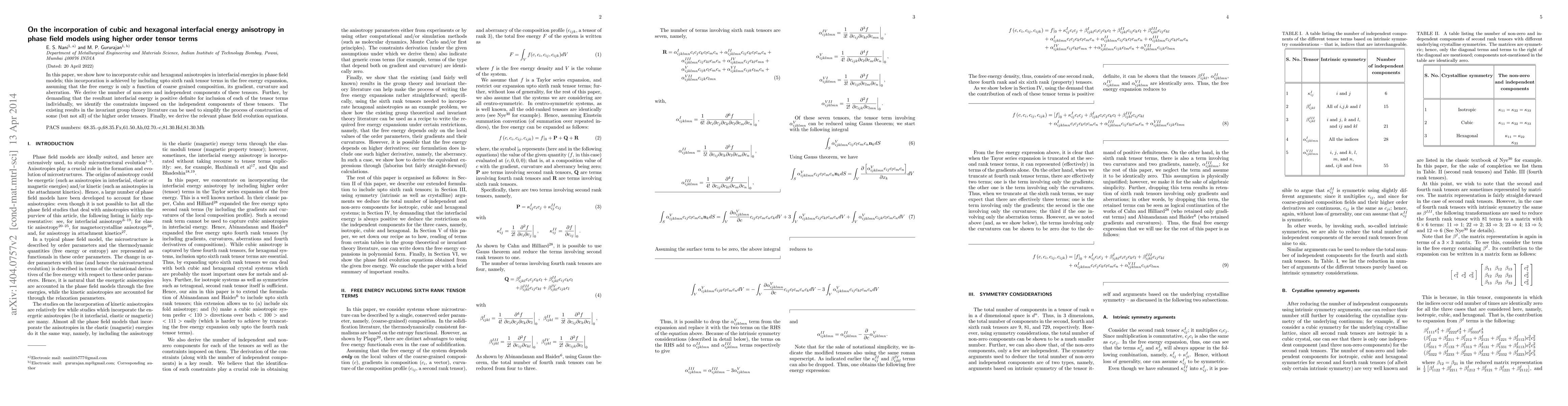 This paper details the incorporation of cubic and hexagonal interfacial energy anisotropies into phase field models by introducing up to sixth rank tensor terms in the free energy expansion. It identifies constraints on tensor components to ensure positive definite interfacial energy and utilizes invariant group theory to simplify tensor construction.