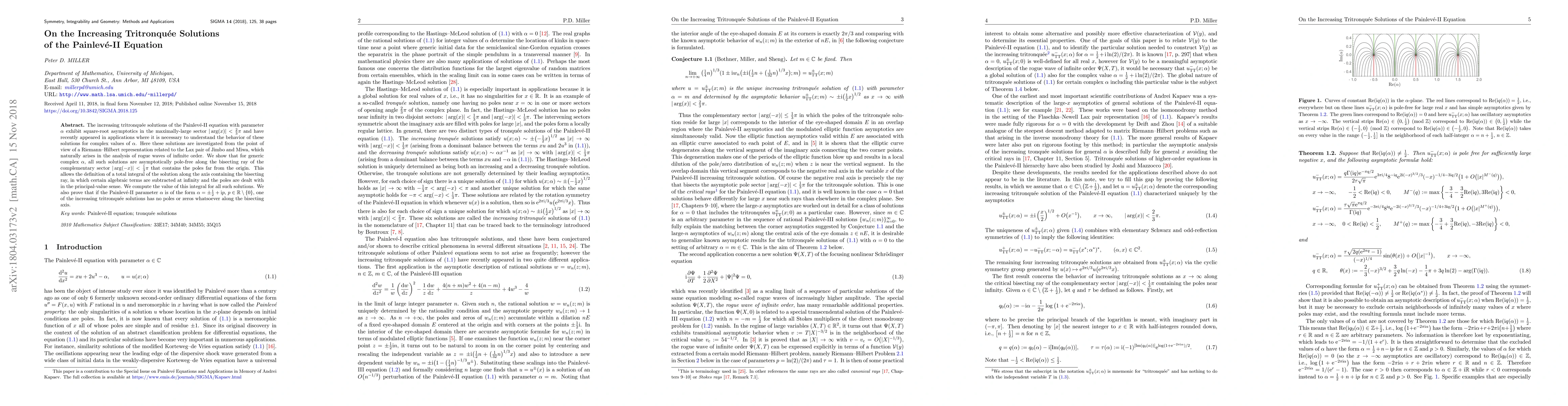 This paper investigates the increasing tritronqu\'ee solutions of the Painlev\'e-II equation, showing they exhibit square-root asymptotics for large $x$. It demonstrates that these solutions are asymptotically pole-free along a specific ray, allowing for the computation of a total integral of the solution, which is free of poles and zeros for certain complex values of $\alpha$.