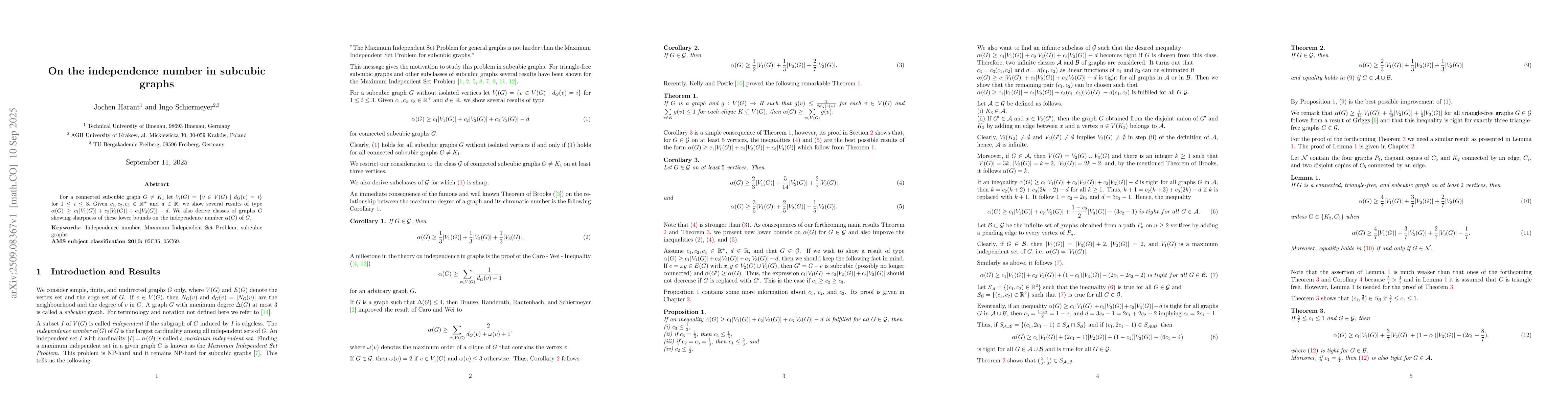 For a connected subcubic graph $G\neq K_1$ let $V_i(G) = \{v \in V(G) ~|~ d_G(v)=i\}$ for $1 \leq i \leq 3.$ Given $c_1, c_2, c_ 3 \in \mathbb{R}^+$ and $ d \in \mathbb{R}$, we show several results of type $\alpha(G) \geq c_1|V_1(G)| + c_2|V_2(G)| + c_3|V_3(G)| - d.$ We also derive classes of graphs $G$ showing sharpness of these lower bounds on the independence number $\alpha(G)$ of $G$.