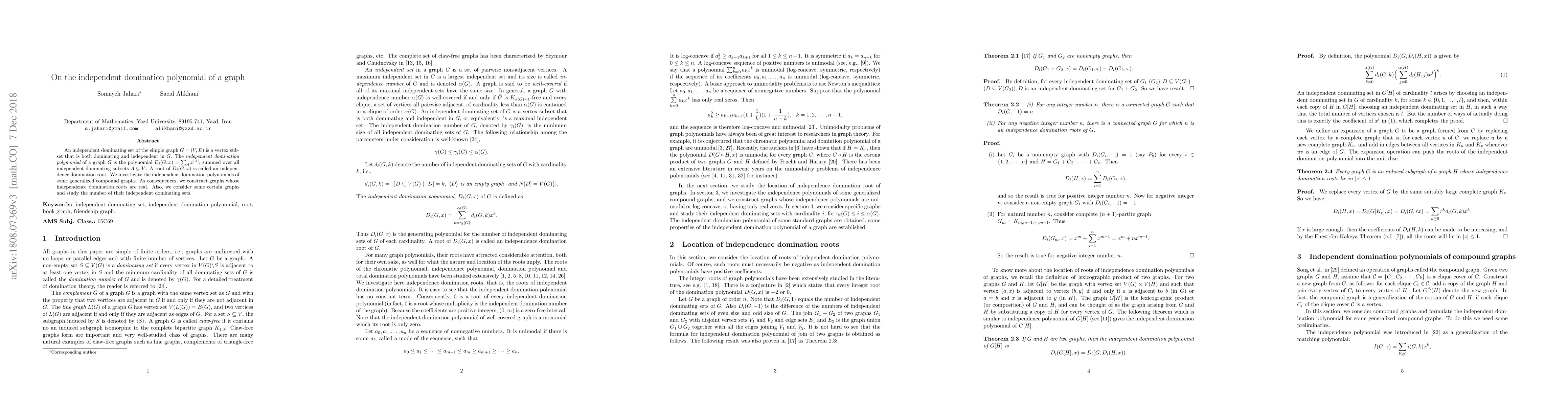 The paper investigates the independent domination polynomial of graphs, a measure that determines the polynomials whose roots correspond to independent dominating sets of the graph. It finds real roots for specific graphs and studies their number.