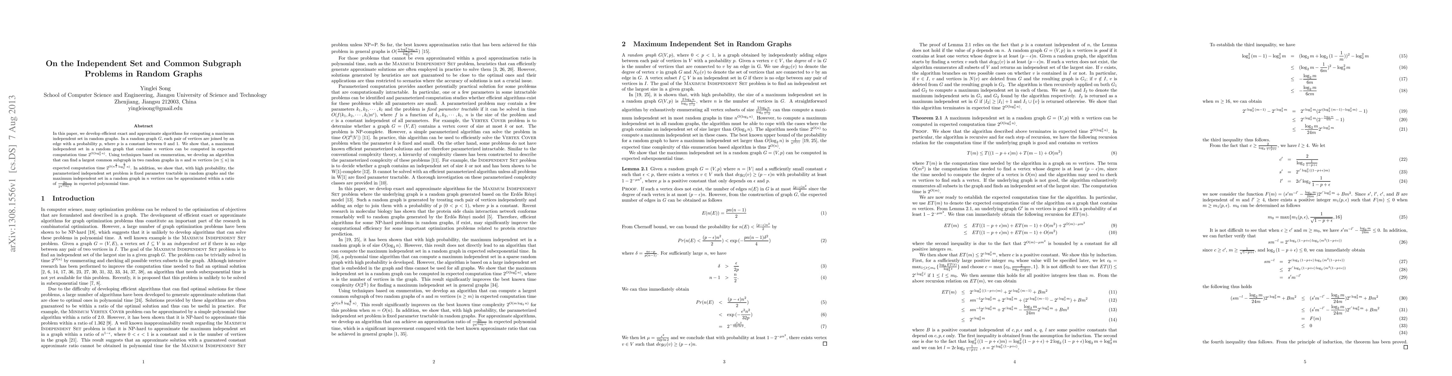 This paper presents efficient algorithms for finding maximum independent sets and largest common subgraphs in random graphs, with computation times scaling polynomially with logarithmic factors. It also demonstrates fixed parameter tractability and an approximation ratio for the independent set problem.