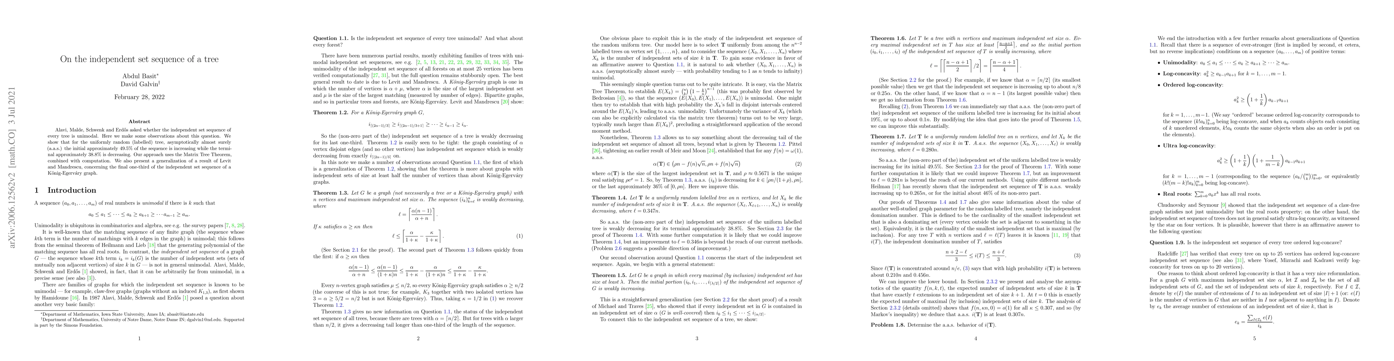 Alavi, Malde, Schwenk and Erd\H{o}s asked whether the independent set sequence of every tree is unimodal. Here we make some observations about this question. We show that for the uniformly random (labelled) tree, asymptotically almost surely (a.a.s.) the initial approximately 49.5\% of the sequence is increasing while the terminal approximately 38.8\% is decreasing. Our approach uses the Matrix Tree Theorem, combined with computation. We also present a generalization of a result of Levit and Mandrescu, concerning the final one-third of the independent set sequence of a K\"onig-Egerv\'ary graph.