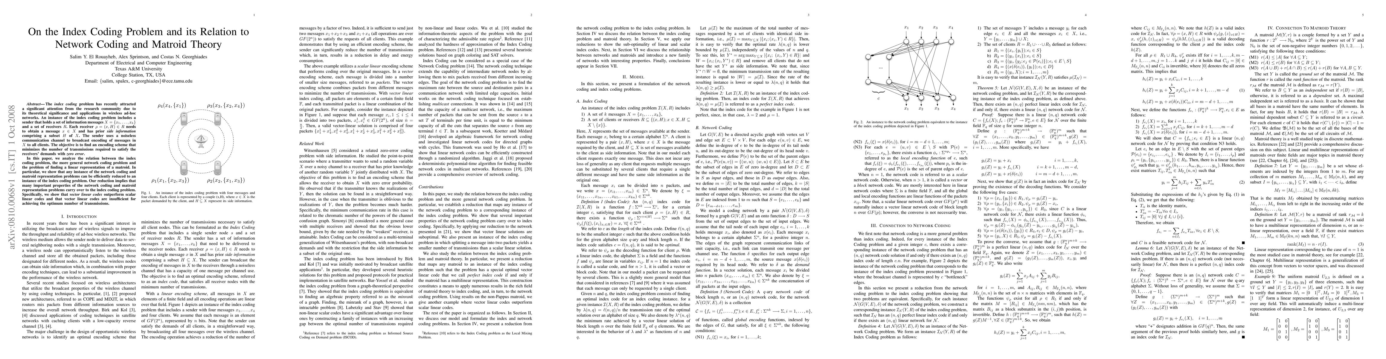 Researchers show that the index coding problem is closely related to network coding and matroid theory, providing new insights into efficient transmission schemes and limiting the effectiveness of certain types of codes.