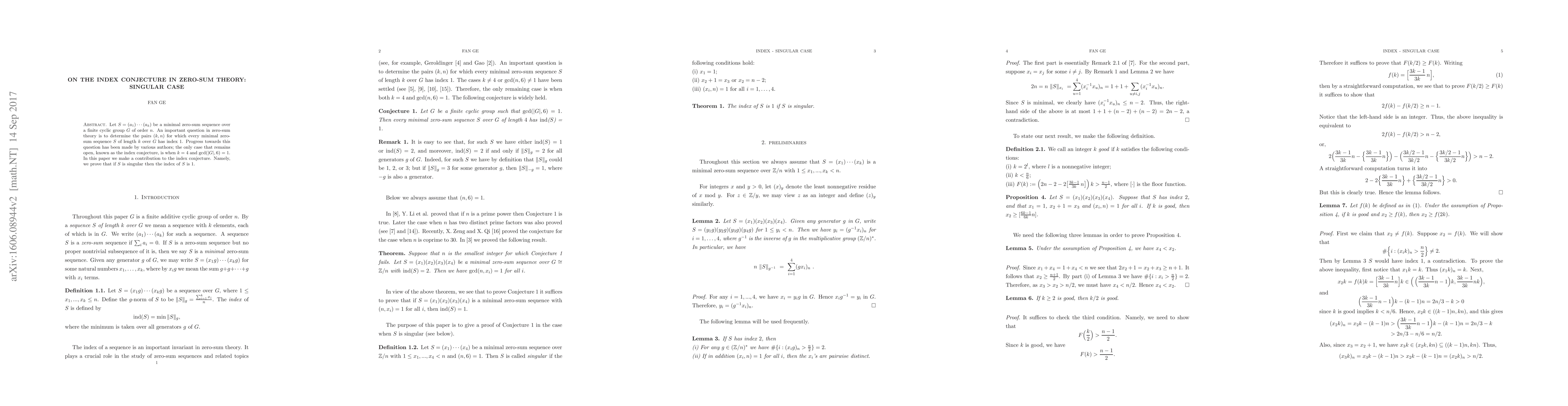 Let $S=(a_1)\cdots(a_k)$ be a minimal zero-sum sequence over a finite cyclic group $G$. The index conjecture states that if $k=4$ and $\gcd(|G|,6)=1$, then $S$ has index $1$. In this paper we prove that if $S$ is singular then the index of $S$ is $1$.