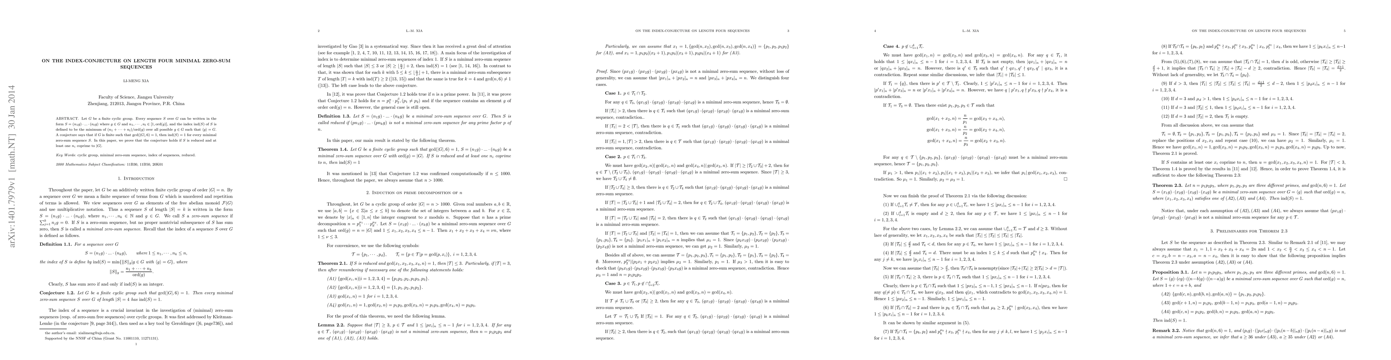 Let $G$ be a finite cyclic group. Every sequence $S$ over $G$ can be written in the form $S=(n_1g)\cdot...\cdot(n_lg)$ where $g\in G$ and $n_1,\cdots,n_l\in[1,{\hbox{\rm ord}}(g)]$, and the index $\ind(S)$ of $S$ is defined to be the minimum of $(n_1+\cdots+n_l)/\hbox{\rm ord}(g)$ over all possible $g\in G$ such that $\langle g\rangle=G$. A conjecture says that if $G$ is finite such that $\gcd(|G|,6)=1$, then $\ind(S)=1$ for every minimal zero-sum sequence $S$. In this paper, we prove that the conjecture holds if $S$ is reduced and at least one $n_i$ coprime to $|G|$.