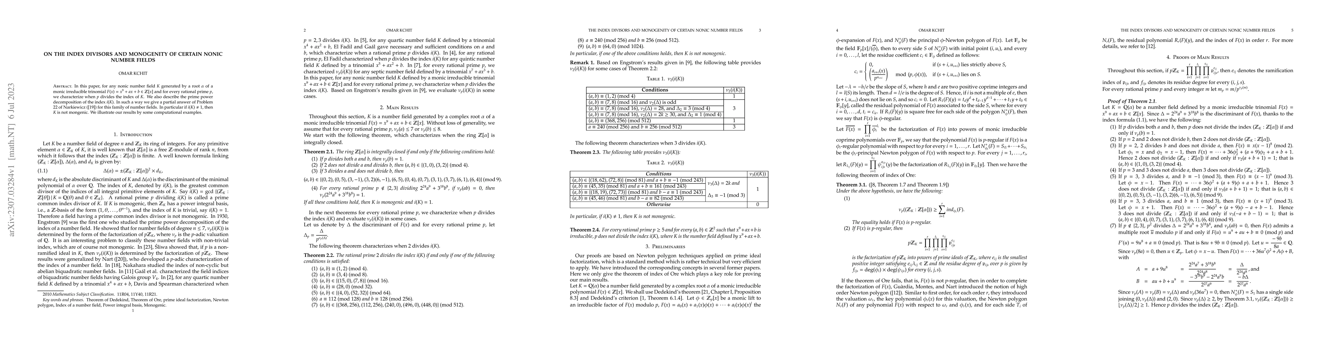 This paper characterizes when rational primes divide the index of nonic number fields generated by roots of monic irreducible trinomials, describing the prime power decomposition of the index. It provides a partial solution to Narkiewicz's Problem 22, showing that if the index is not 1, the field is not monogenic, and includes computational examples.
