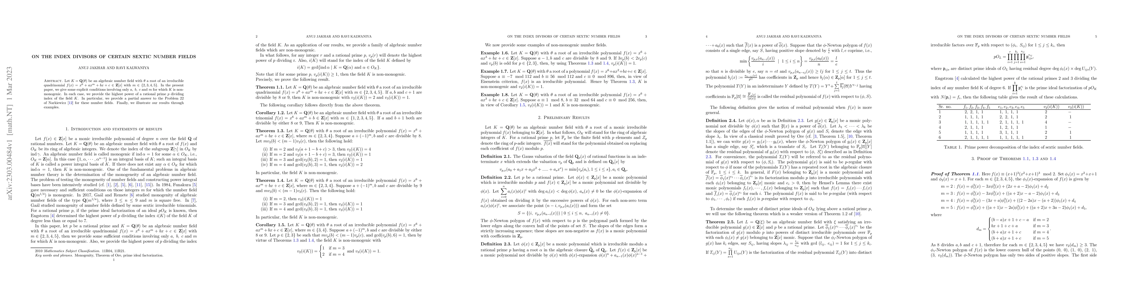 Let $K=\Q(\theta)$ be an algebraic number field with $\theta$ a root of an irreducible quadrinomial $f(x) = x^6+ax^m+bx+c\in\Z[x] $ with $m\in\{2,3,4,5\}$. In the present paper, we give some explicit conditions involving only $a,~b,~c$ and $m$ for which $K$ is non-monogenic. In each case, we provide the highest power of a rational prime $p$ dividing index of the field $K$. In particular, we provide a partial answer to the Problem $22$ of Narkiewicz \cite{Nar} for these number fields. Finally, we illustrate our results through examples.