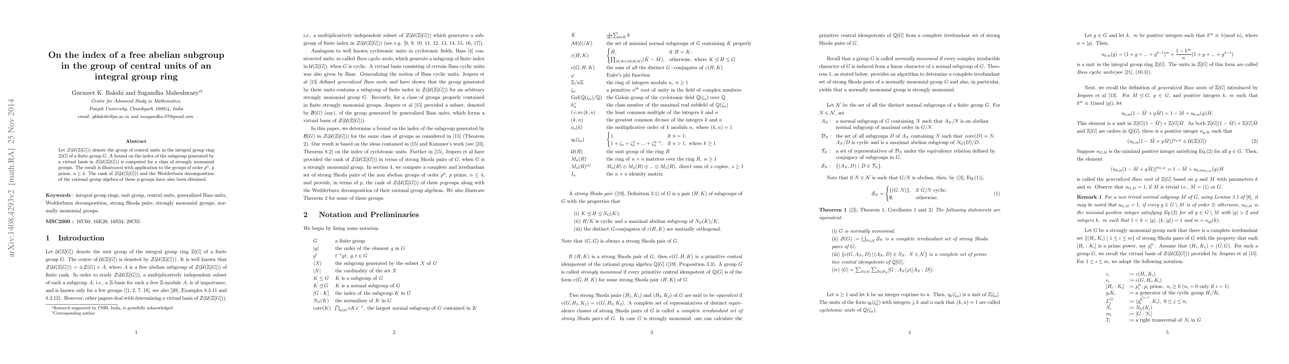 Let $\mathcal{Z}(\mathcal{U}(\mathbb{Z}[G]))$ denote the group of central units in the integral group ring $\mathbb{Z}[G]$ of a finite group $G$. A bound on the index of the subgroup generated by a virtual basis in $\mathcal{Z}(\mathcal{U}(\mathbb{Z}[G]))$ is computed for a class of strongly monomial groups. The result is illustrated with application to the groups of order $p^{n}$, $p$ prime, $n \leq 4$. The rank of $\mathcal{Z}(\mathcal{U}(\mathbb{Z}[G]))$ and the Wedderburn decomposition of the rational group algebra of these $p$-groups have also been obtained.