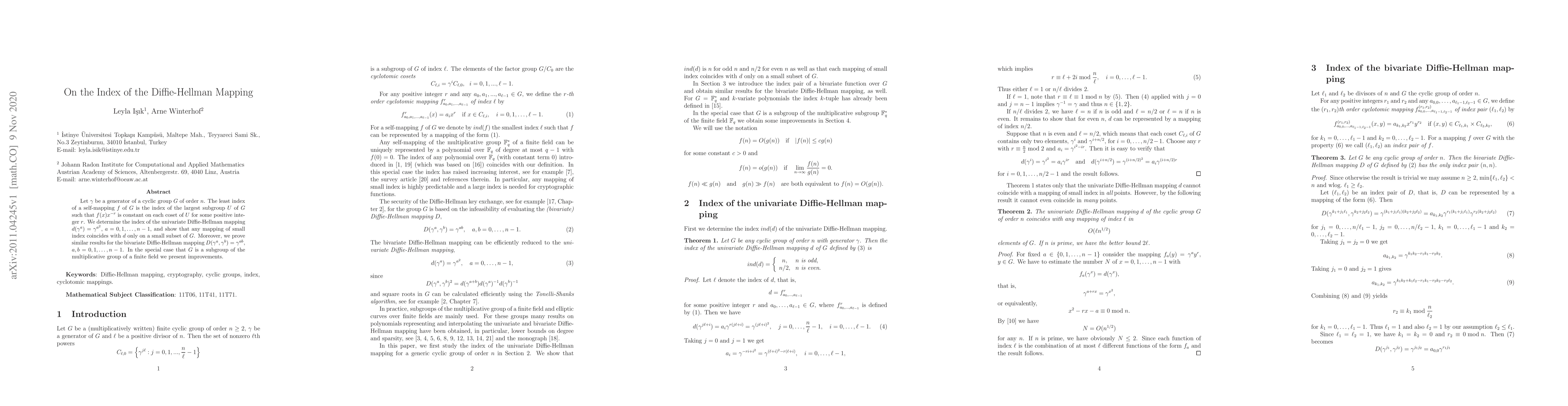The paper provides a detailed analysis of the index of univariate and bivariate Diffie-Hellman mappings, proving key theorems about their properties and providing improved results for specific cases.